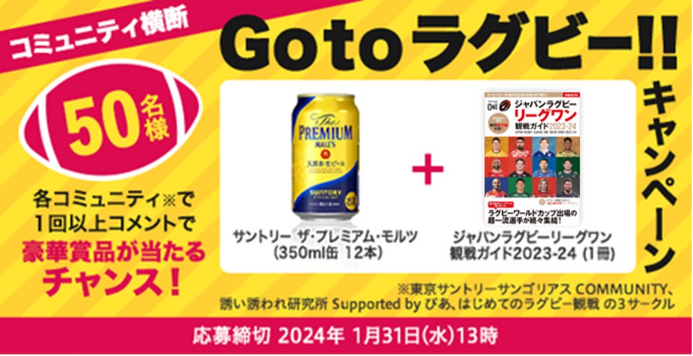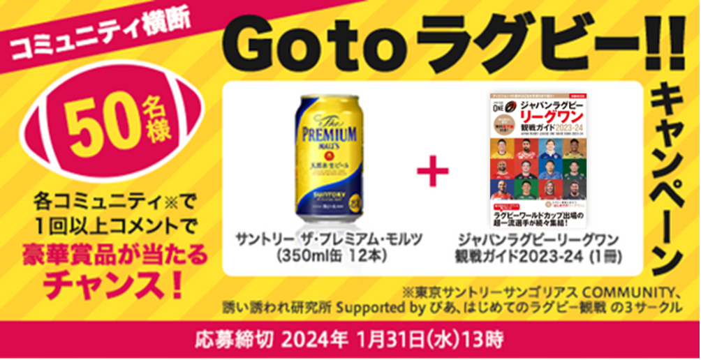 キャンペーン期間中、「東京サントリーサンゴリアス COMMUNITY」「はじめてのラグビー観戦」「誘い誘われ研究所 Supported by ぴあ」の3つのコミュニティで指定されたトピックにそれぞれ1回以上コメントし、応募フォームに必要事項を入力された方の中から抽選で50名様に、サントリー「ザ・プレミアム・モルツ(350ml缶 12本)」と、「ジャパンラグビー リーグワン 観戦ガイド 2023-24」をセットにしてプレゼントします。