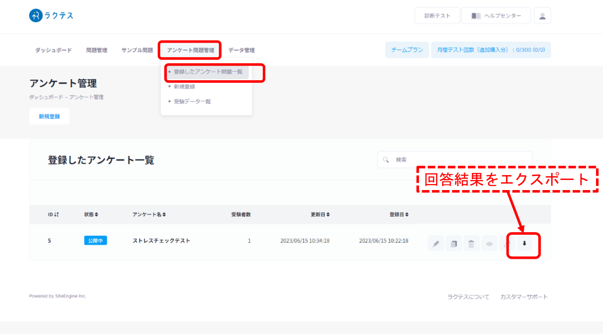 「アンケート問題管理」→「登録したアンケート問題一覧」から、対象となるアンケート問題の右端にある「↓」ボタンを押し、Excel形式の回答結果データをダウンロードします。