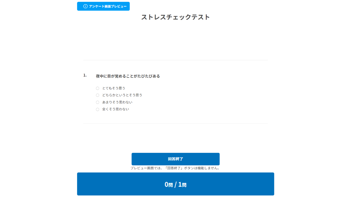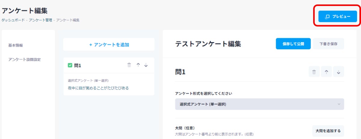 アンケート編集画面上部の「プレビュー」をクリックして、テストのプレビュー画面を確認します。問題がなければ公開し、テストを実施します。