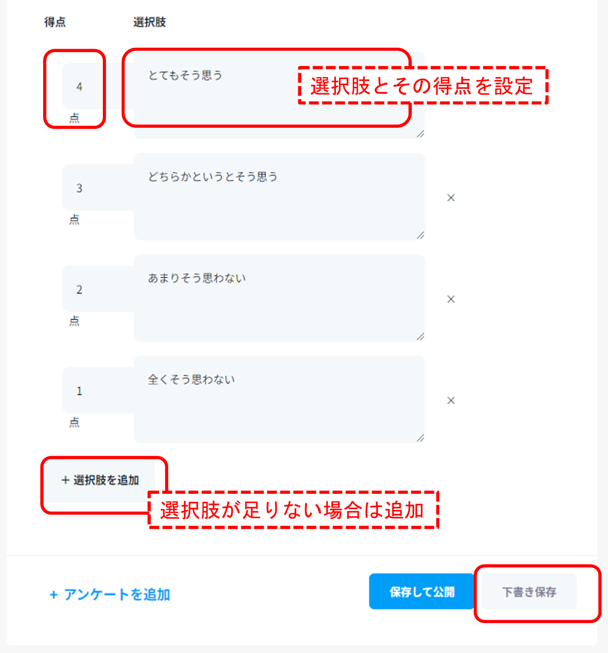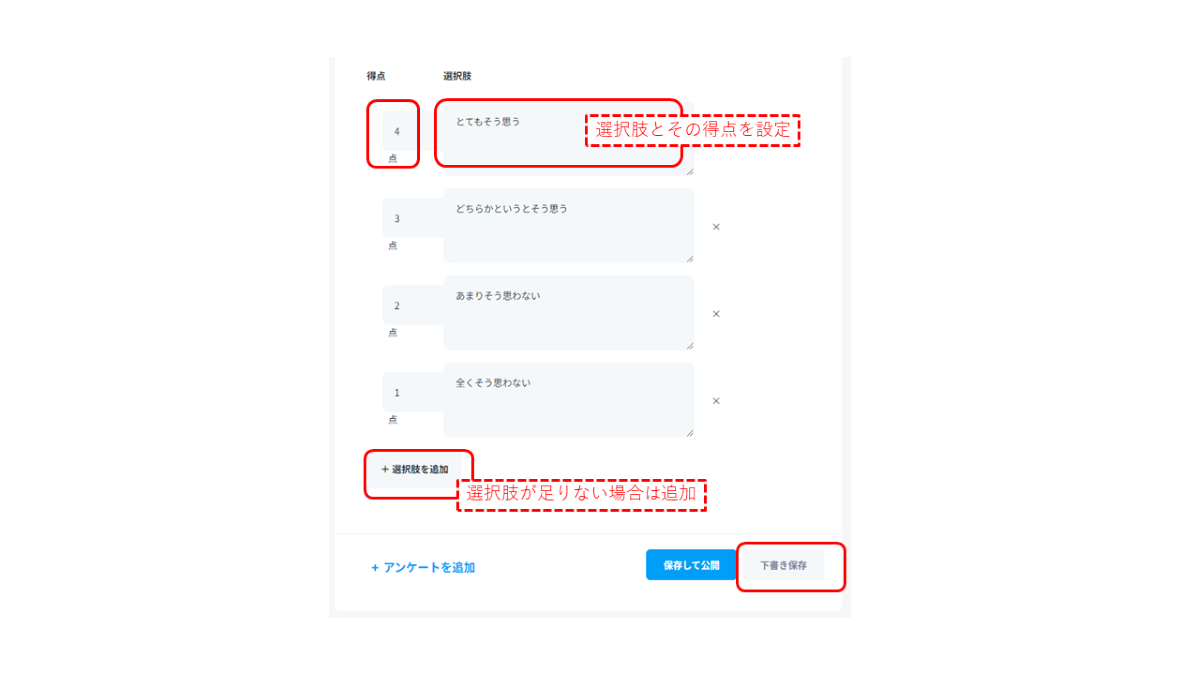 回答の選択肢と点数を設定します。選択肢が足りない場合は「+選択肢を追加」ボタンで追加できます。アンケートの編集が終わったら「下書き保存」をクリックします。