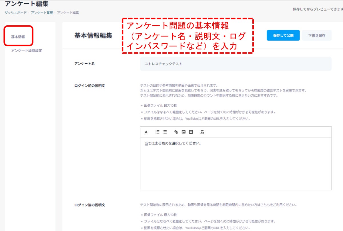 「基本情報」をクリックし、アンケート名、受験パスワードなどの情報を入力します。