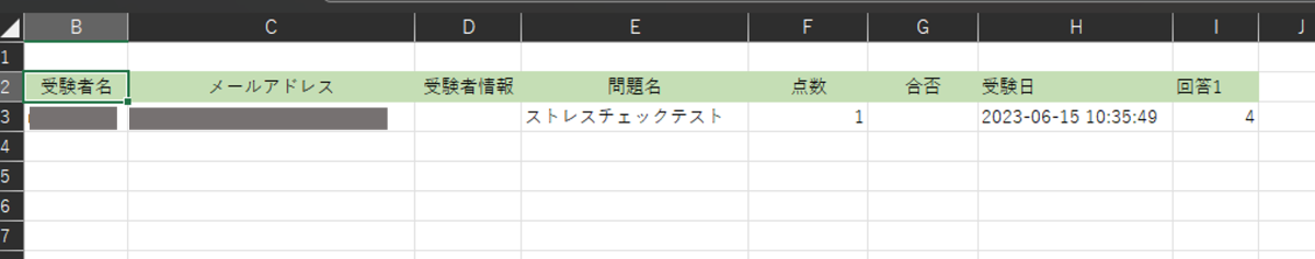 受験者名、メールアドレス、回答した選択肢の番号(記述式の場合はその内容)、点数をExcel上で管理・集計できます。