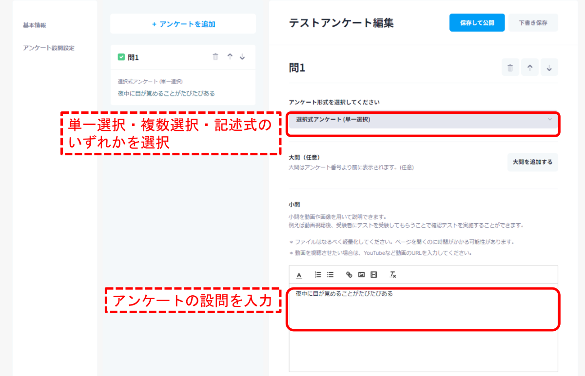 「アンケート設問設定」→「+アンケートを追加」をクリックします。単一選択・複数選択・記述式からアンケート形式を選択し、設問の内容を記入します。