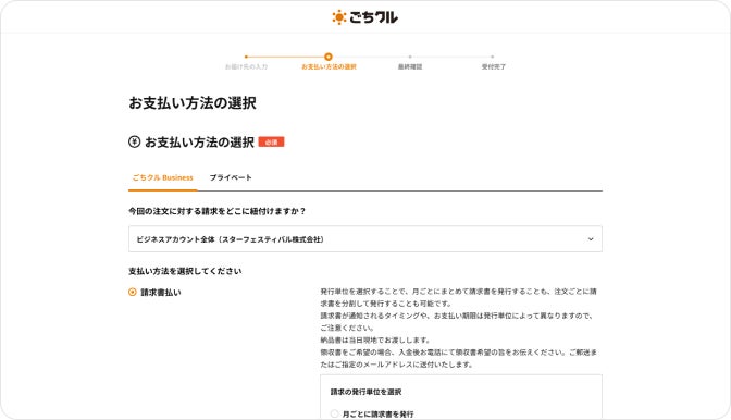 月ごとに1枚の請求書、またはグループ(部署、イベントなど)ごとに請求書を分ける設定ができます。従業員はごちクルでのご注文時に自分が所属するグループに割り当てられた支払い方法から選択することができるので予算管理に便利です。