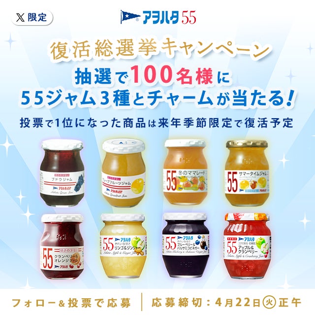 アップル&シナモンと、ピーチ・メルバは2006年に季節限定品として発売し、好評だった2品です。また、ブドウは2002年に発売し、ブドウのプルプルとした食感と、風味豊かですっきりとした味が特長です。アヲハタ公式Xでは、4月22日までお客様に向けた復活総選挙キャンペーンを実施しています。投票で1位になった商品は、実際に来年以降に季節限定で復活を予定しています。