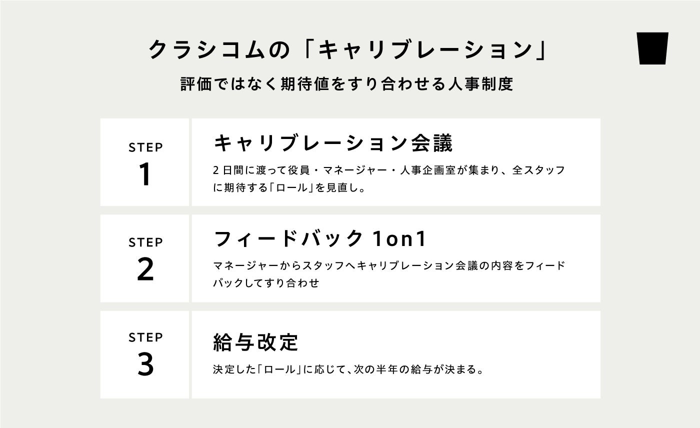 人が人を評価するのはとても難しいという前提に基づき、会社が個人を個別のKPI数値等で「評価」するのではなく、会社が個人へ期待する役割(ロール)を半年に一度「調整(キャリブレーション)」することを基本とする人事制度です。