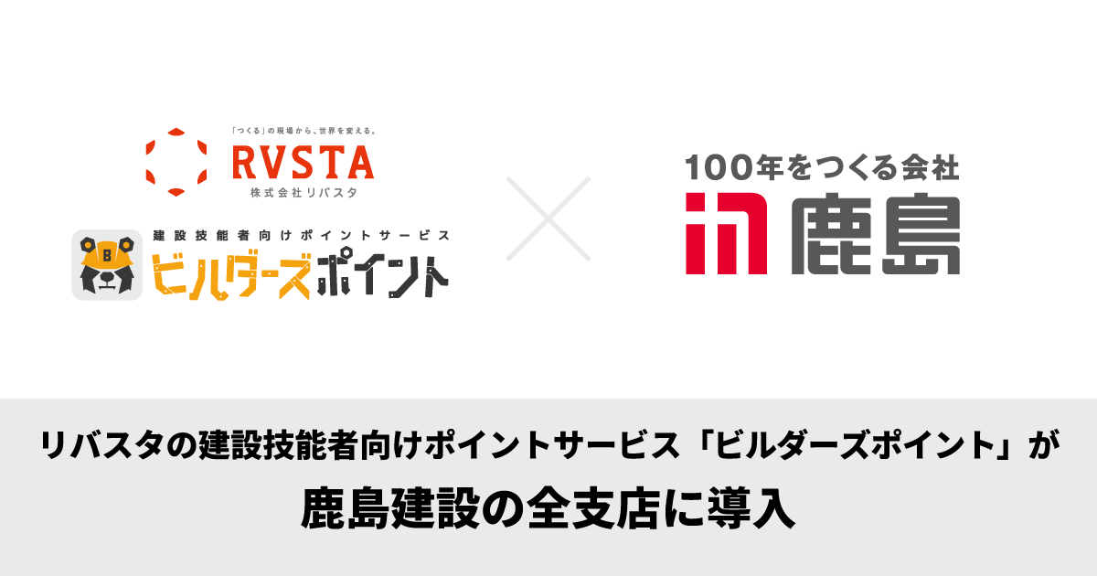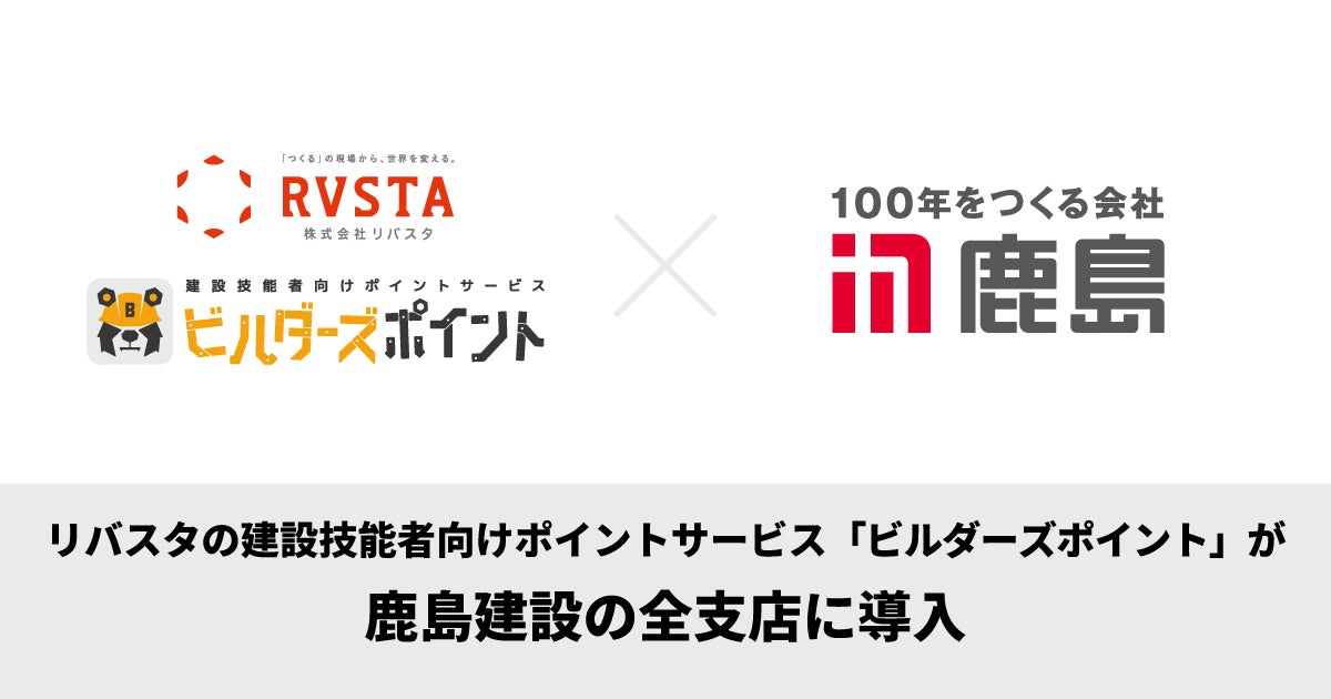 株式会社リバスタ(本社:東京都江東区、代表取締役:高橋巧、以下 当社)は、当社が提供する建設技能者向けポイントサービス「ビルダーズポイント」が、鹿島建設株式会社(本社:東京都港区、代表取締役会長兼社長:押味至一、以下 鹿島建設)の全支店に導入されたことをお知らせします。