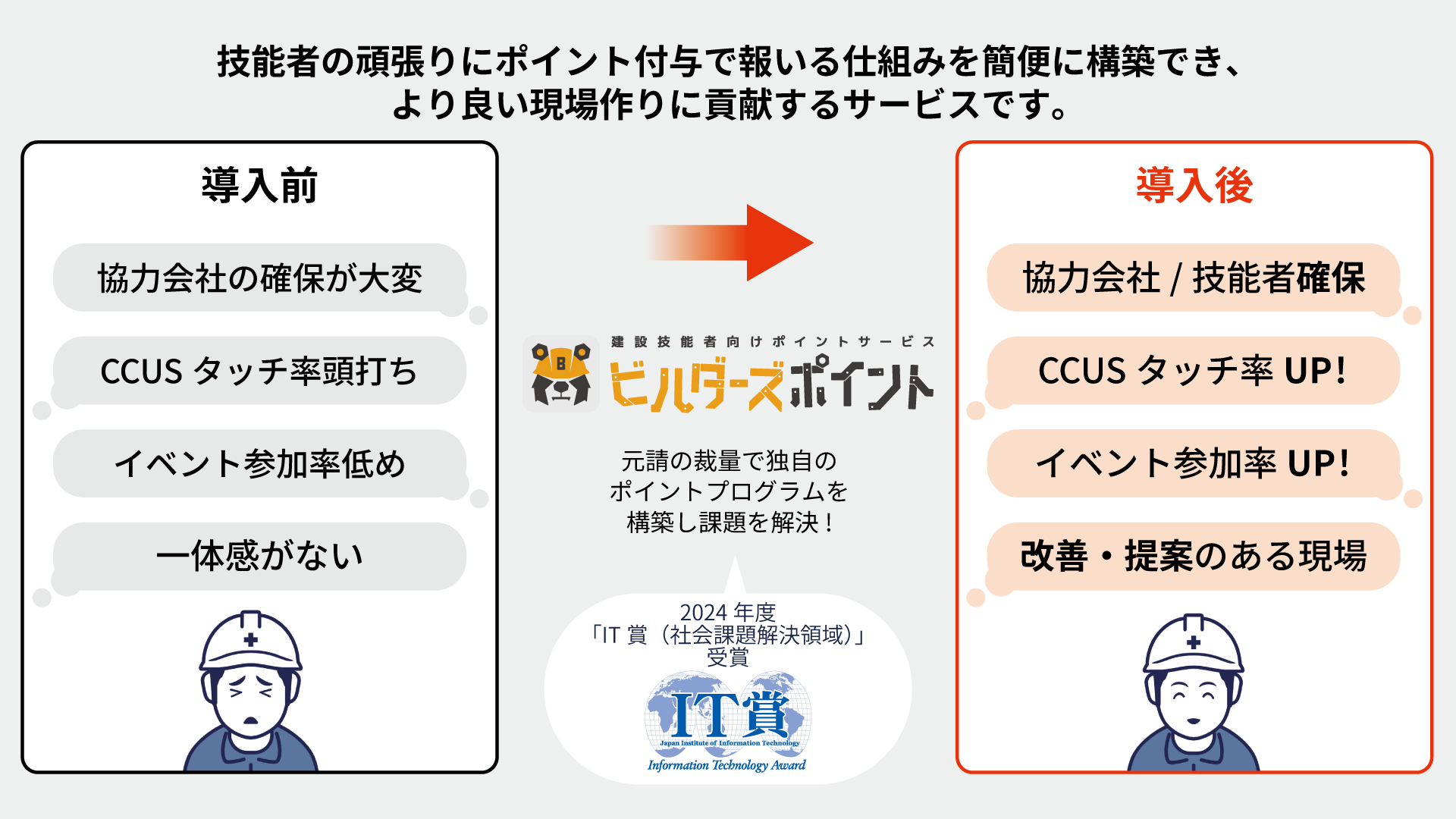 また「Buildee」と連携し、入退場記録に基づくポイントの一斉付与など、現場運用に即したスムーズなポイント運用も実現します。「ビルダーズポイント」は、技能者のモチベーション向上や魅力的な現場の創出による、業界の課題解決に向けたサービス設計が評価され、2024年度「IT賞(社会課題解決領域)」を受賞するとともに、「日本のサービスイノベーション2025」に選出されました。