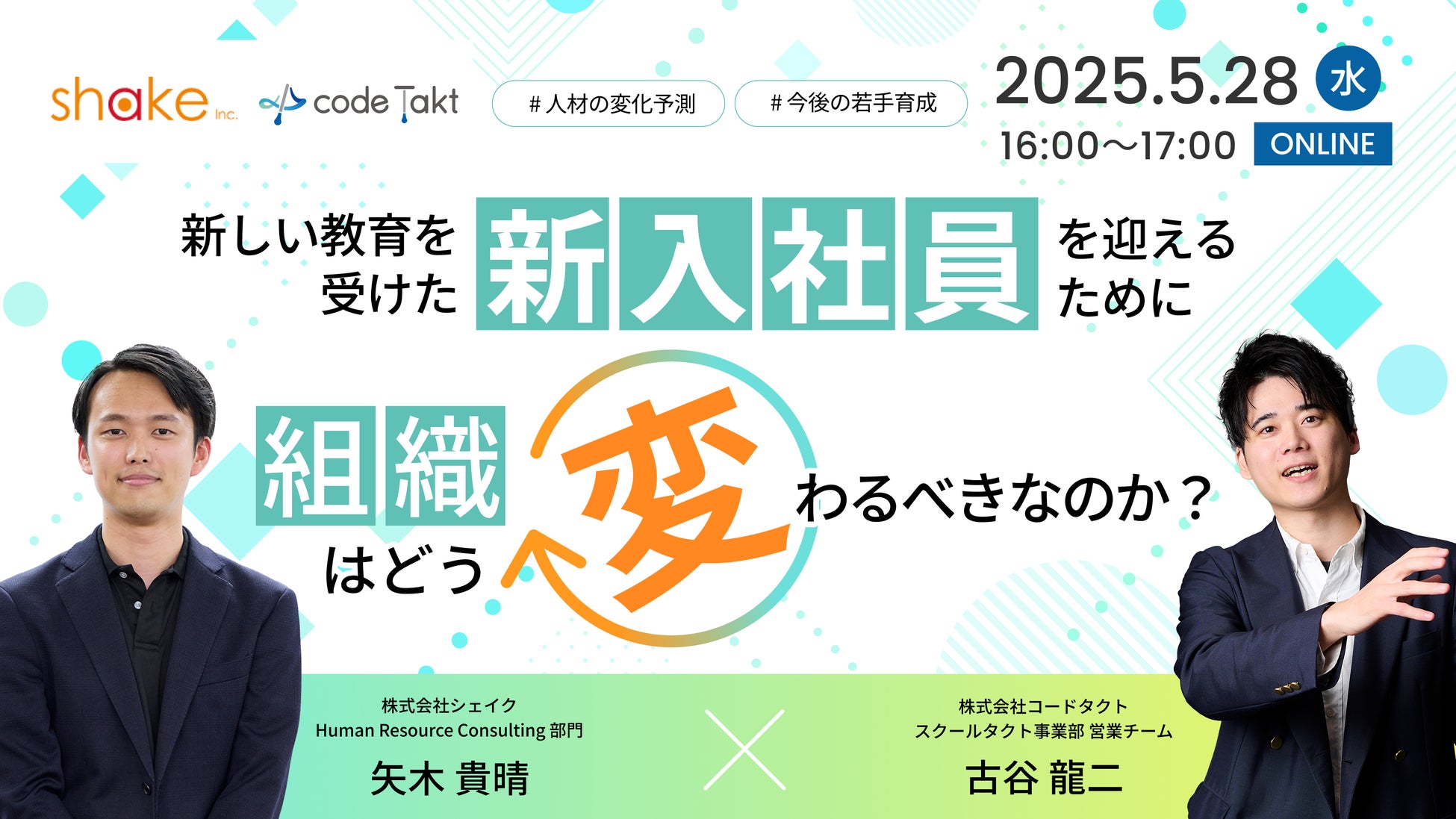 本セミナーは、人材育成・組織コンサルティングを行う「シェイク」と、学校現場での学びの支援をルーツに持つ「チームタクト」の共催です。2025年度新入社員の特徴や傾向から、新入社員の成長を効果的なものにするための育成ポイントをお伝えします。また、現代の学校教育の方向性や学びの実践から、今後入社してくる社員の傾向や職場に対して求めるものを探り、彼らが活躍し定着する職場づくりについて考えていきます。