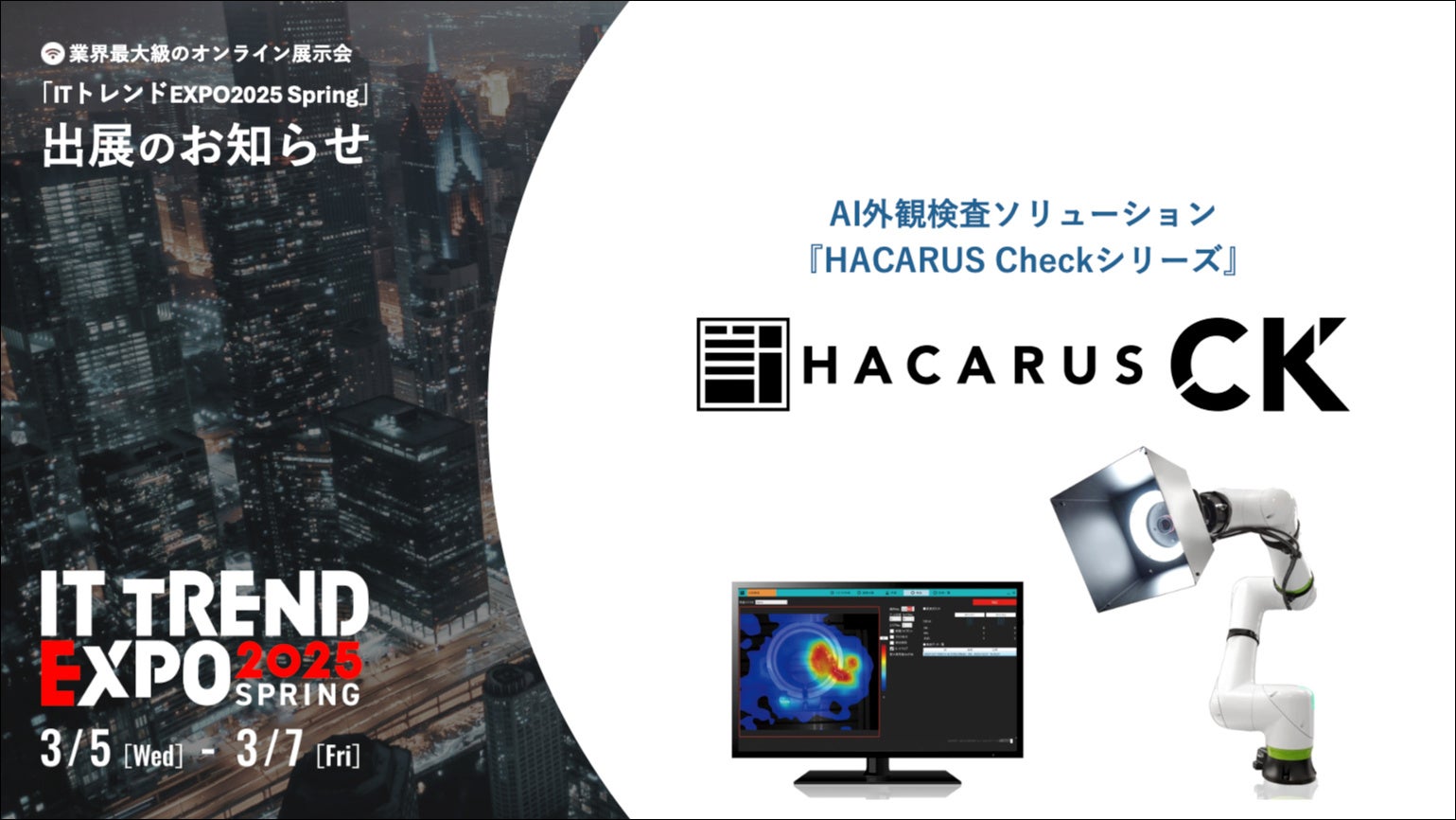 株式会社HACARUS(本社:京都市中京区、代表取締役CEO:染田貴志)は、2025年3月5日(水)から3月7日(金)まで開催される「ITトレンドEXPO2025 Spring」に出展することをお知らせいたします。本展示会では、AI外観検査ソリューション『HACARUS Checkシリーズ』を展示し、外観検査に関する最新技術や製品を紹介します。