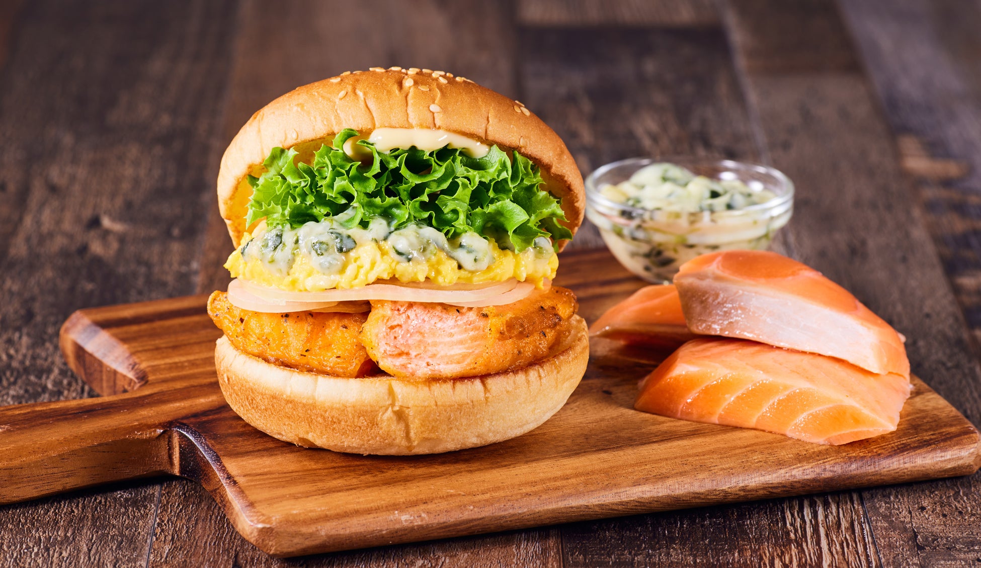 ふっくら柔らかく、ジューシーで濃厚な味わい。希少な“キングサーモン”が主役!店内調理でさっくりと揚げた贅沢バーガー新登場!