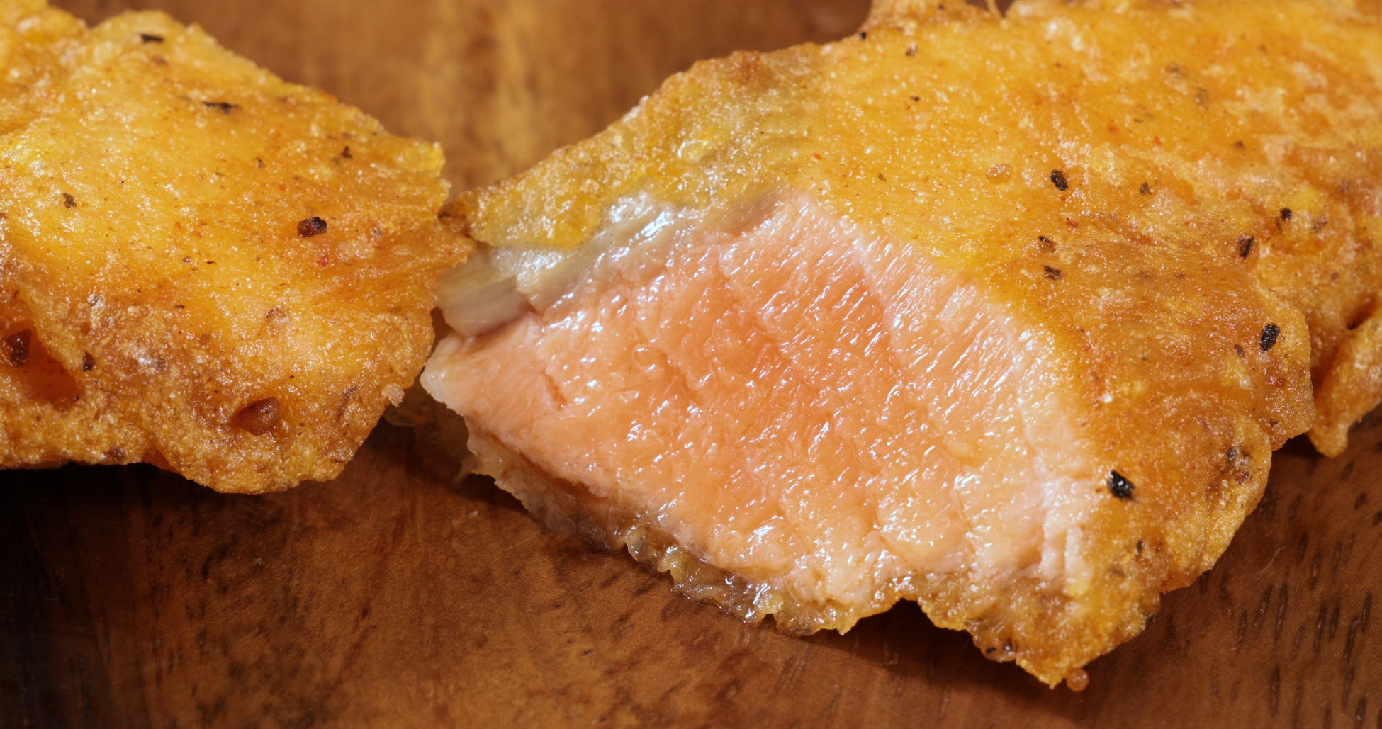 生食でも食べられる新鮮なキングサーモンを店内で衣付けから行い、フライにすることで、さっくりふっくらと仕上げました。