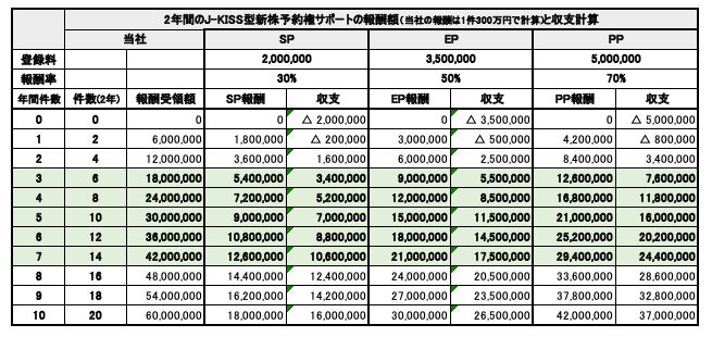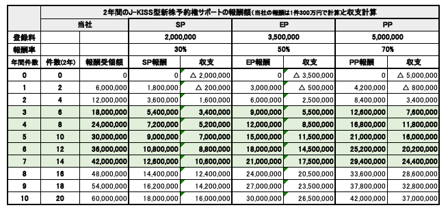 当社の計画では、J-KISS型新株予約権の自己募集スキームのコンサルティング業務だけでも、パートナー1社あたりの案件獲得は、年間で3件~7件と見込んでいます。平均的な報酬で計算を行った場合の、各パートナー区分における2年間の獲得件数別の報酬見込み額は以下の通りです。