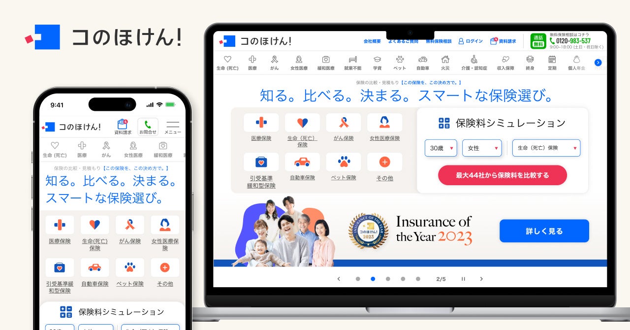 「コのほけん!」は、保険選びをオンラインで完結できるデジタル保険代理店です。 保険の見積り・比較・検討・申込まですべてをデジタル化し「自分に合った保険を、自分で選べる世界」を実現します。コのほけん!は直感的に操作しやすく、イラストやインフォグラフィックスを取り入れることで、複雑で分かりづらいと思われがちな保険商品を見やすく、分かりやすく掲載しています。また、口コミや専門家のコメントが充実しておりインターネットがあれば時と場所を選ばず、保険を検討することができます。コのほけん!では、毎月最新のおすすめ医療保険・人気の商品をランキング形式で紹介しております。気になる商品を比較できる360度比較ページや、医療保険についての基礎知識で保険選びをサポートします。