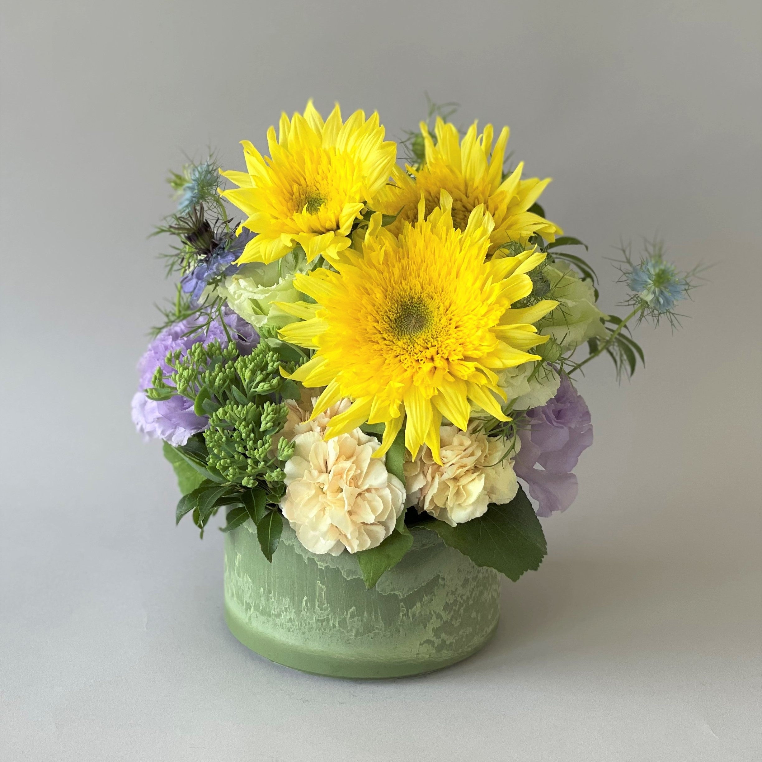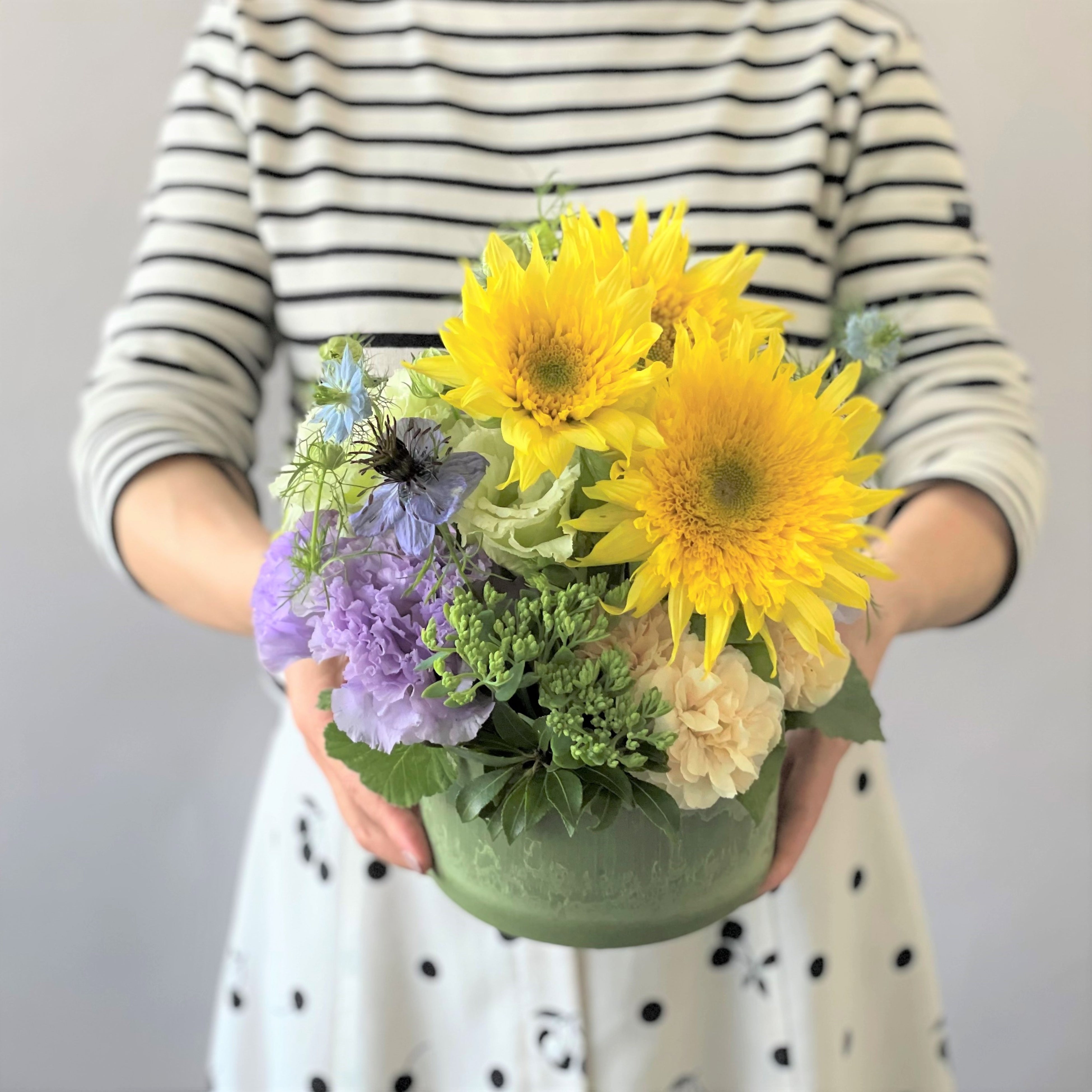 器つきのアレンジメントは、そのまま飾れる便利なアイテム。花瓶を用意する必要がないのでギフトにもおすすめです。