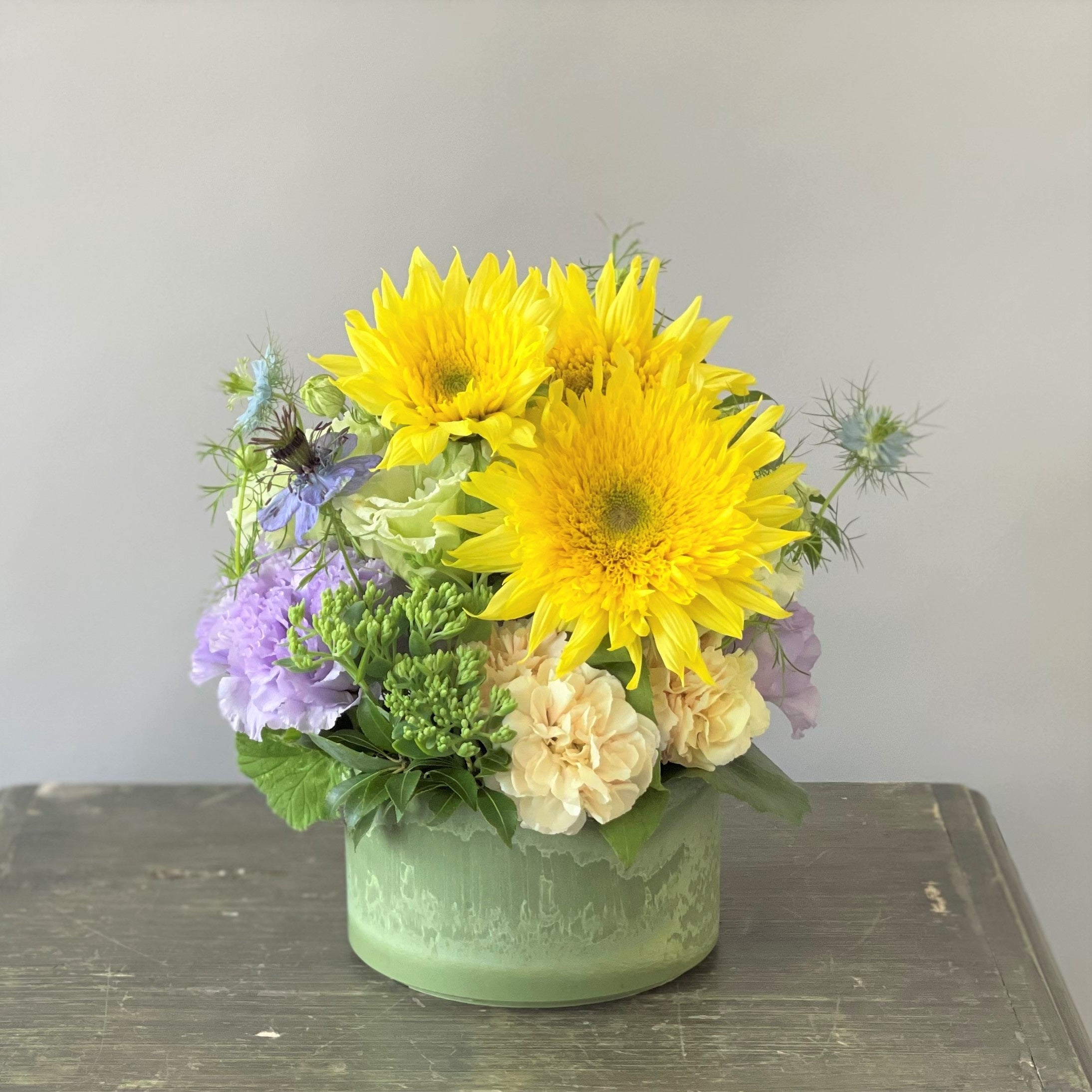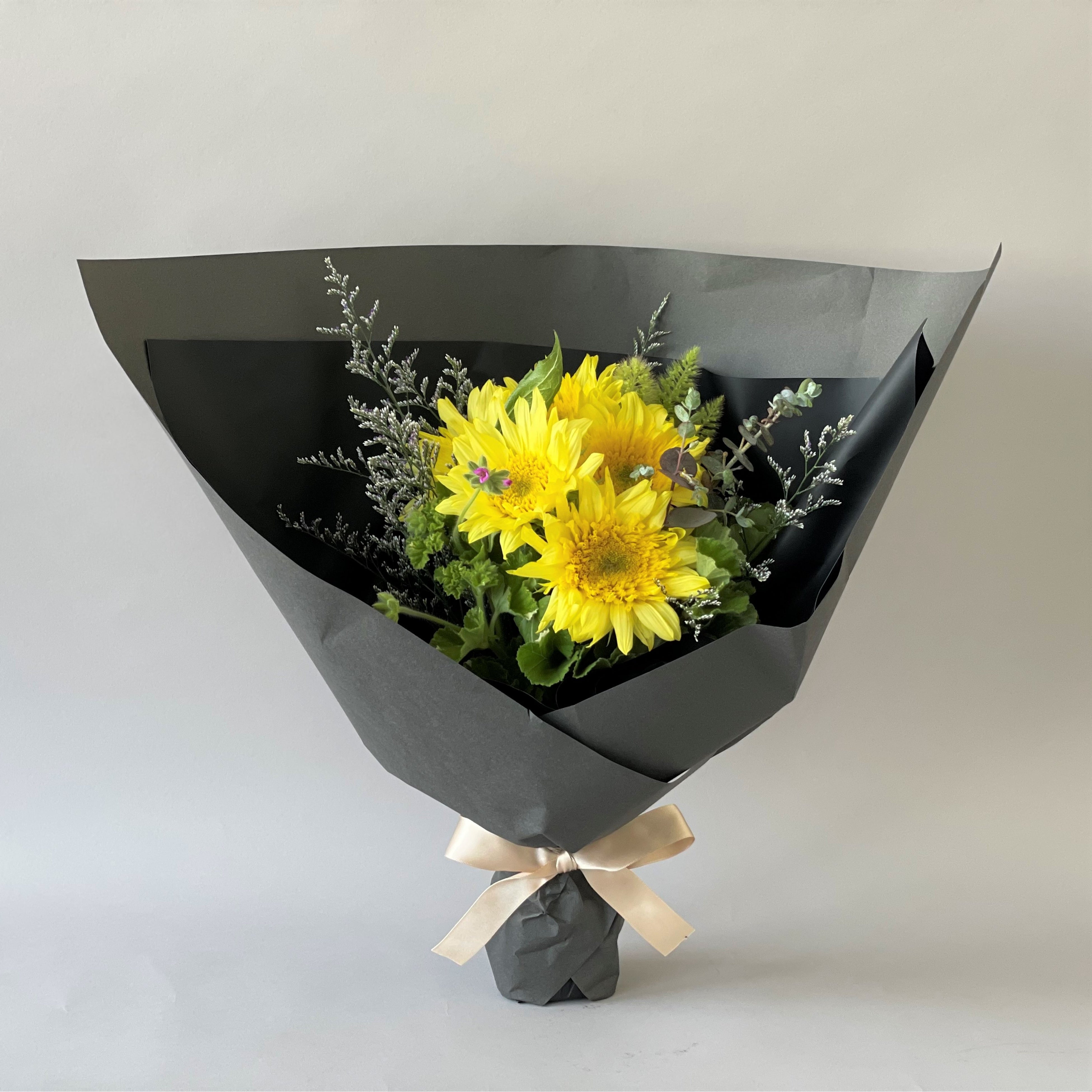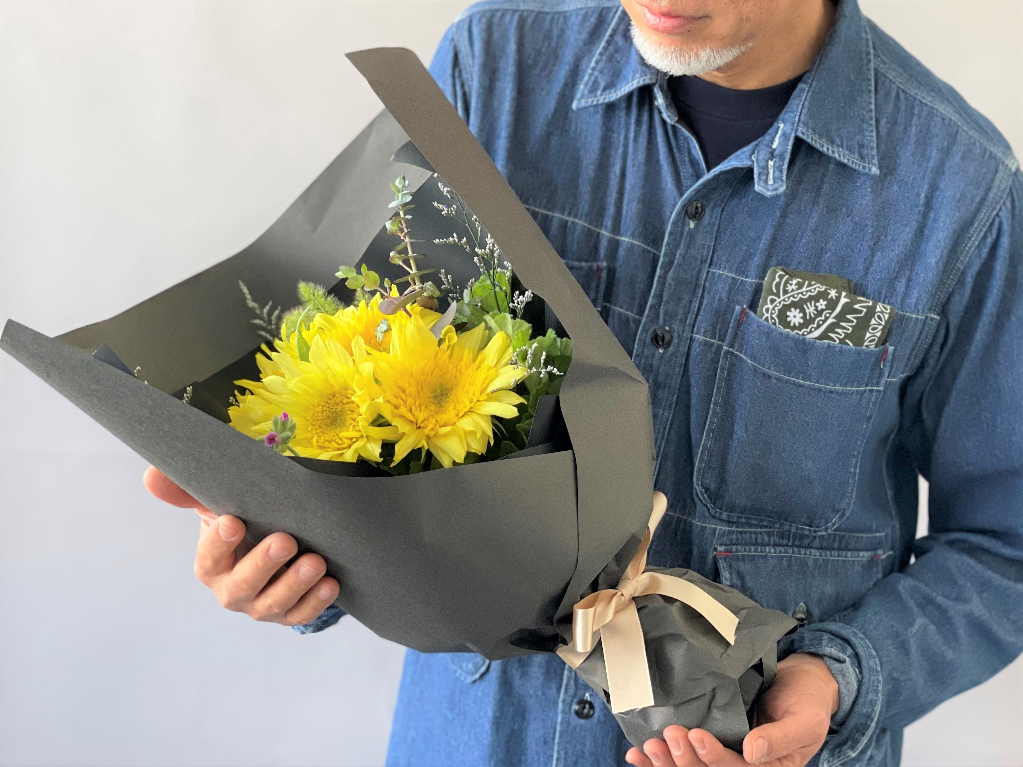 ヒマワリとフレッシュなグリーンをざっくりと束ねたスタイリッシュなブーケは父の日のギフトにもぴったりです。