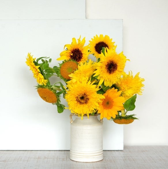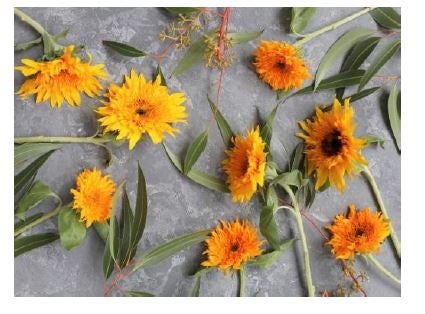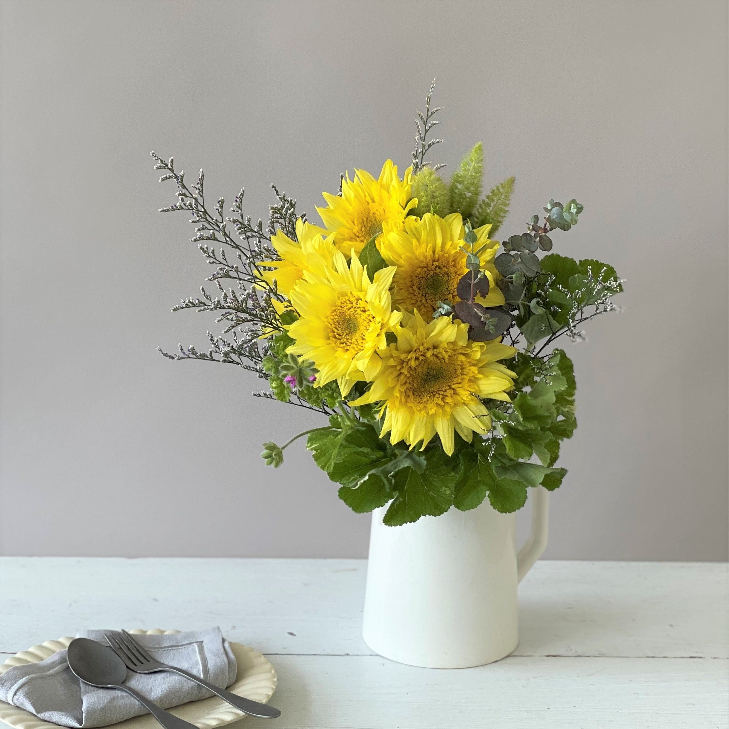 (左)ゴッホの名画のようにヒマワリだけをざっくりと。花びらが傷んでしまったものも花びらだけを取り除いてアクセントとして加えています。
