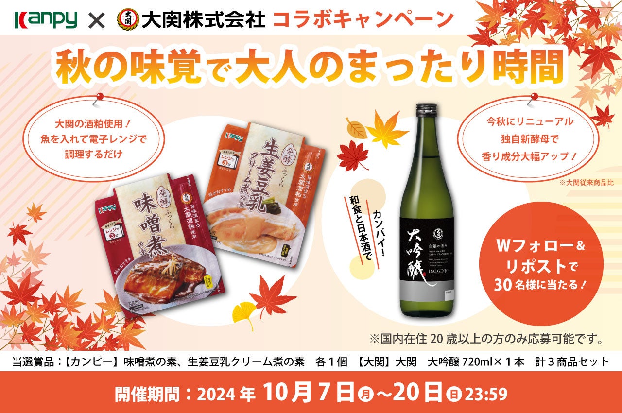 「カンピー 味噌煮の素」「カンピー 生姜豆乳クリーム煮の素」の発売を記念し、カンピー×大関株式会社コラボキャンペーンを両Xアカウントにて実施いたします。
