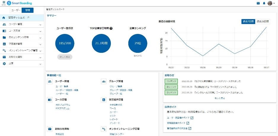 操作マニュアルや機能に関するお知らせ、管理機能の一覧が一画面で表示されます。また、自社で使用中のID数や、全利用企業の中でユーザー平均学習時間が1位の企業の学習時間、それに対する自社の順位などもわかるようになりました。使いたい機能をすぐに選択できるようになっただけでなく、自社の活動状況が一目見てわかるようになります。