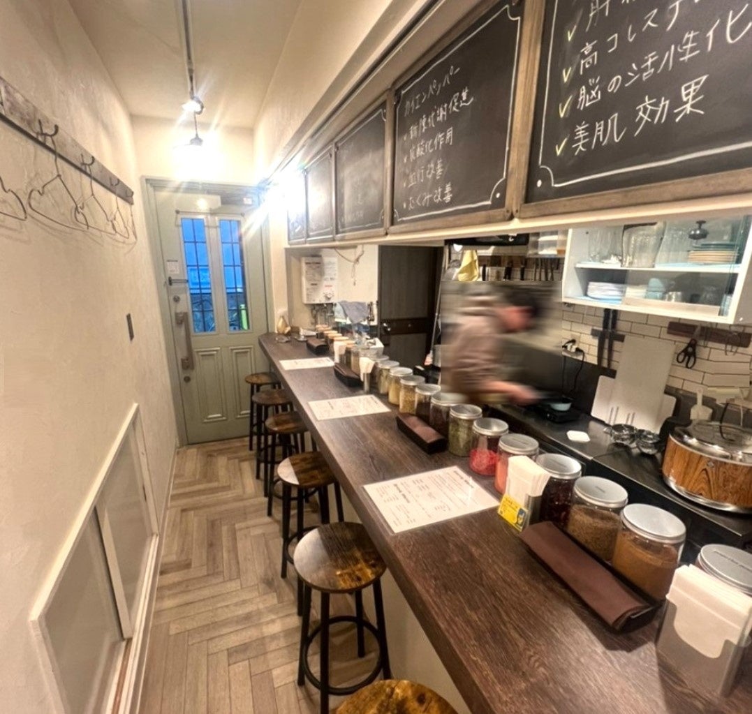 スタイリッシュなカレースタンド: お一人様でも気兼ねなく楽しめるカウンター席を中心としたモダンな店内。忙しい合間のランチや、仕事終わりの一杯と共に楽しむカレーなど、多様なシーンに対応します。