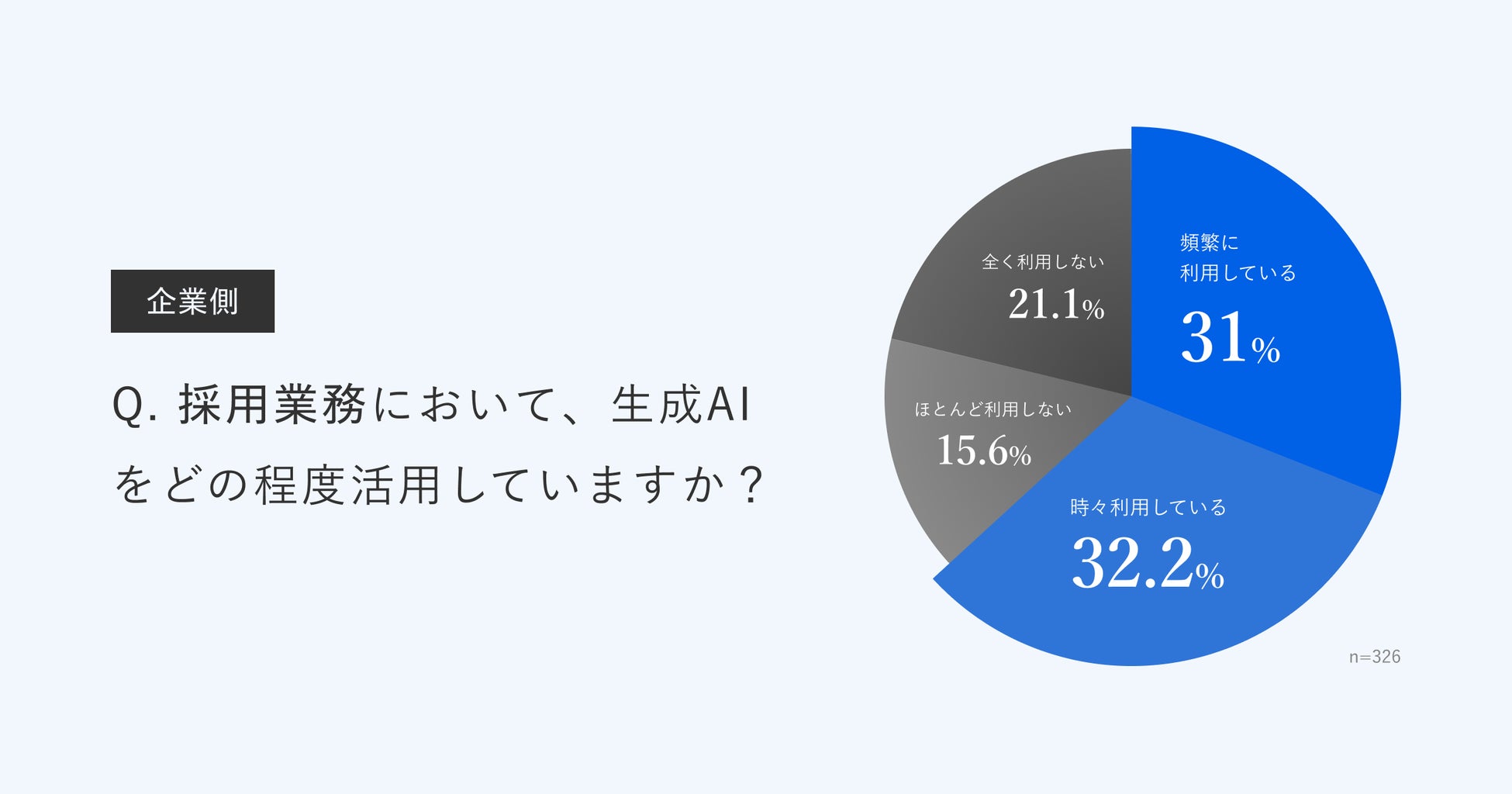 企業で採用業務に関わる採用担当者・人事責任者・経営者・現場社員に向けて、採用業務においてAIをどの程度活用しているか聞いたところ、31.0%が「頻繁に利用している」、32.2%が「時々利用している」と回答し、6割以上が業務で日常的にAIを活用していることがわかりました。