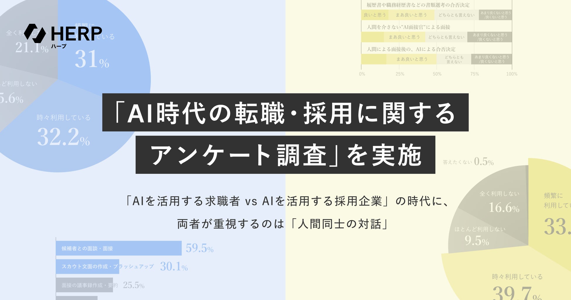HERPは、企業と求職者のより良い出会いを創出するため、企業と求職者のそれぞれにAIサービスを提供する立場から、両者のAI活用の実態や本音を明らかにし、AI時代の採用のあるべき姿のヒントを探るため、本調査を実施しました。
