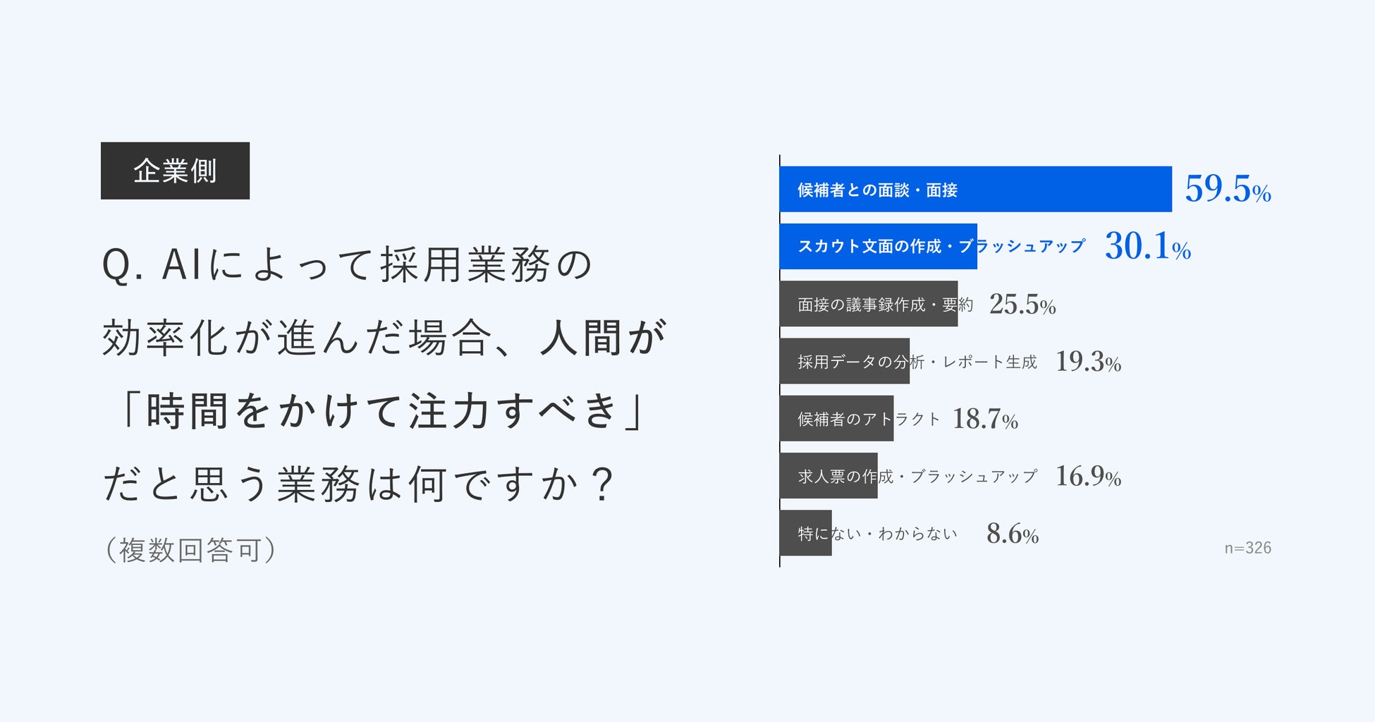 さらに、AIによって採用業務の効率化が進んだ場合、人間が「時間をかけて注力すべき」だと思う業務を尋ねたところ、最多は「候補者との面談・面接」59.5%、次いで「スカウト文面の作成・ブラッシュアップ」30.1%でした。