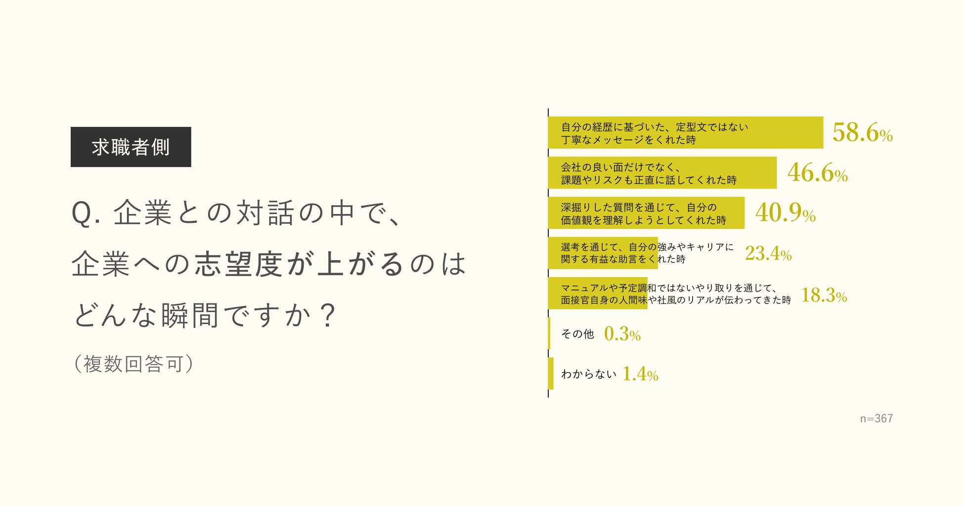 具体的に企業との対話の中で志望度が上がる瞬間について尋ねたところ、最多は「自分の経歴に基づいた、定型文ではない丁寧なメッセージをくれた時」58.6%、次いで「会社の良い面だけでなく、課題やリスクも正直に話してくれた時」46.6%となりました。「個別の尊重」をされていると感じた時や、企業から開示された情報に「誠実さ・透明性」を感じた時に、特に企業への好感を抱きやすい傾向が窺えます。