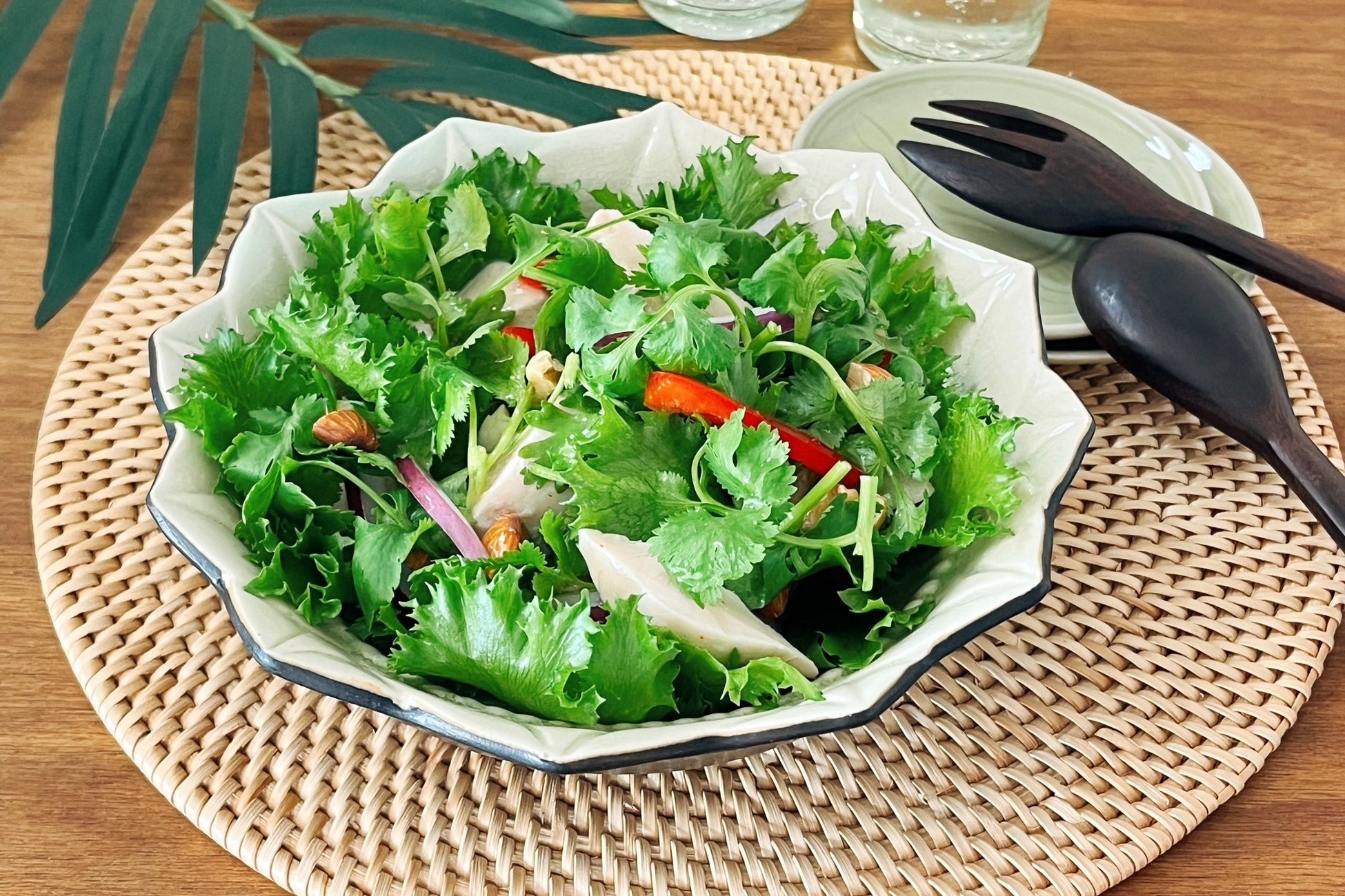 そこで、ナンプラーやレモングラスなど、エスニック料理に欠かせない調味料をバランスよく配合したノンオイルドレッシングを開発しました。子どもから大人まで楽しめるよう、辛さを抑えた爽やかな味わいに仕上げています。エスニック料理特有の調味料を揃えることなく、これ一本で簡単にエスニック風サラダを作ることができます。また、タイ風サラダのヤムウンセンや、生春巻きのソース、ベトナム料理のバインミーなど、幅広いメニューに活用できます。