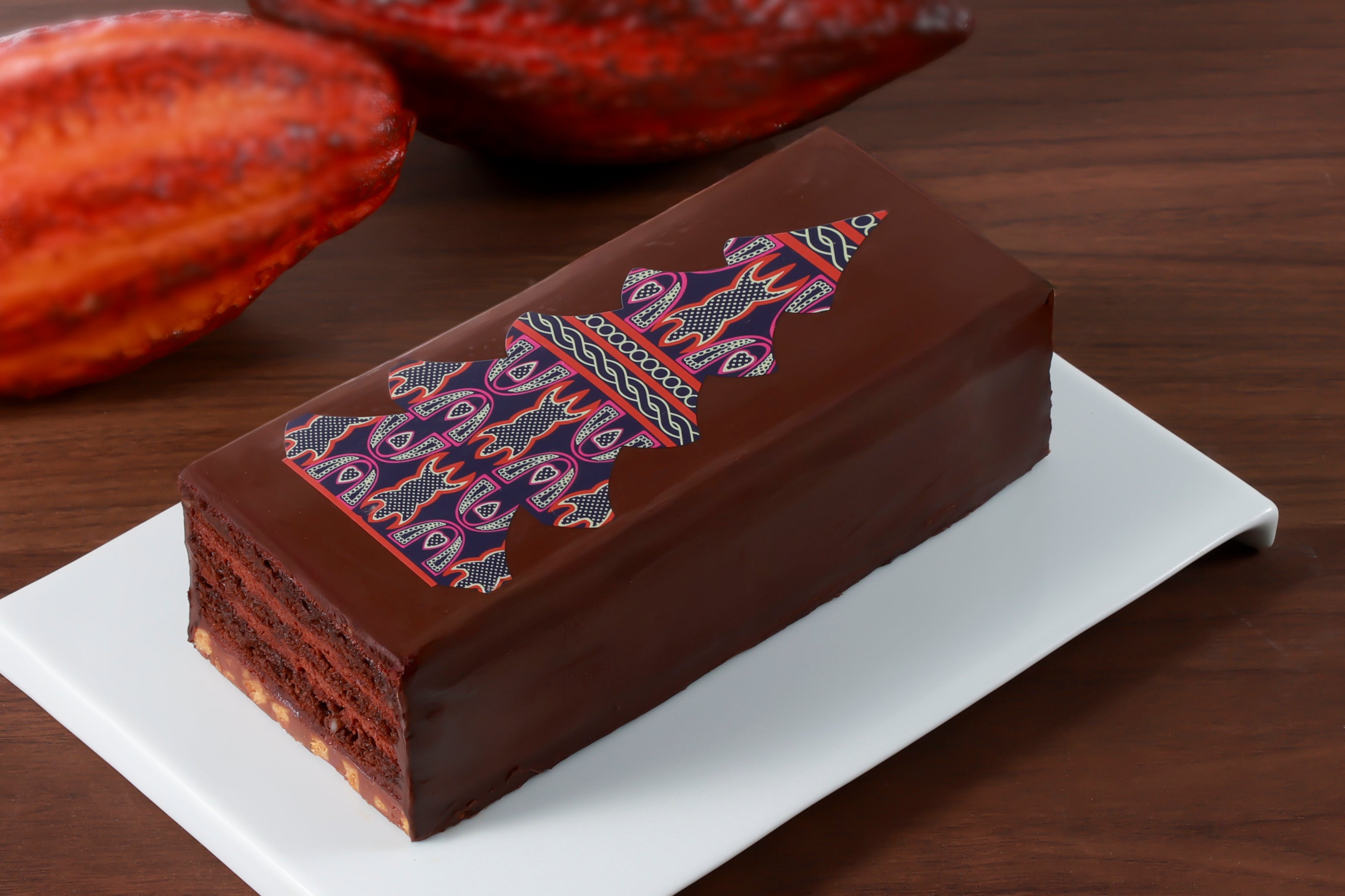 カカオの原産国を讃えて、アフリカの伝統的な織物で華やかに彩った”旅するビュッシュ”です。