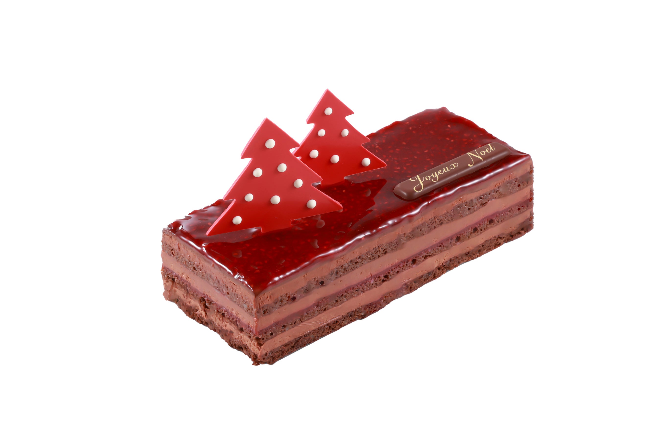 ヴェネズエラ産カカオを使用したムースと、フランボワーズのコンフィチュール、アーモンドとカカオのビスキュイを重ねたガトー。ショコラでできた赤いツリーと、艶やかなフランボワーズのコンフィチュールがクリスマスを彩ります。
