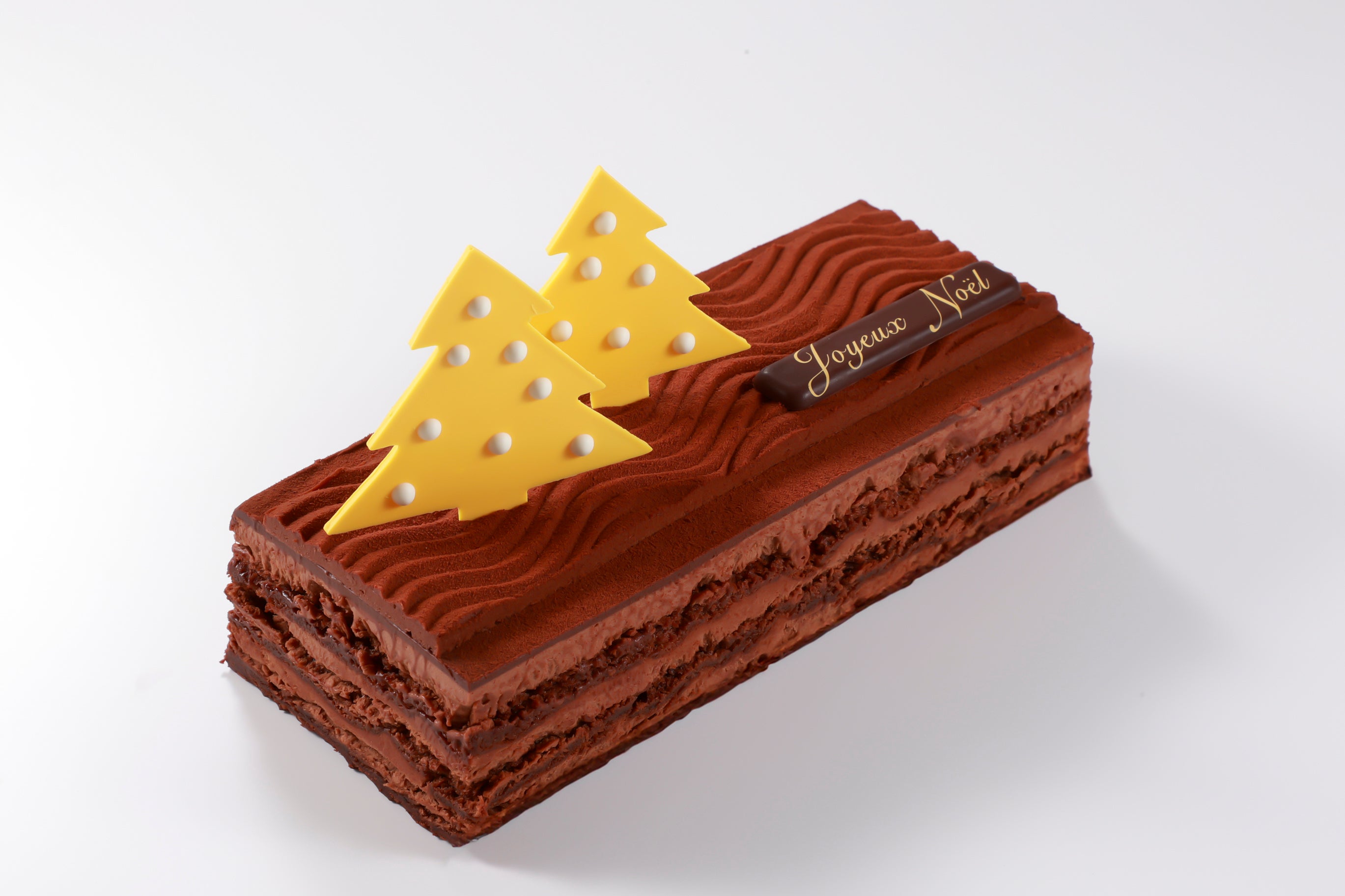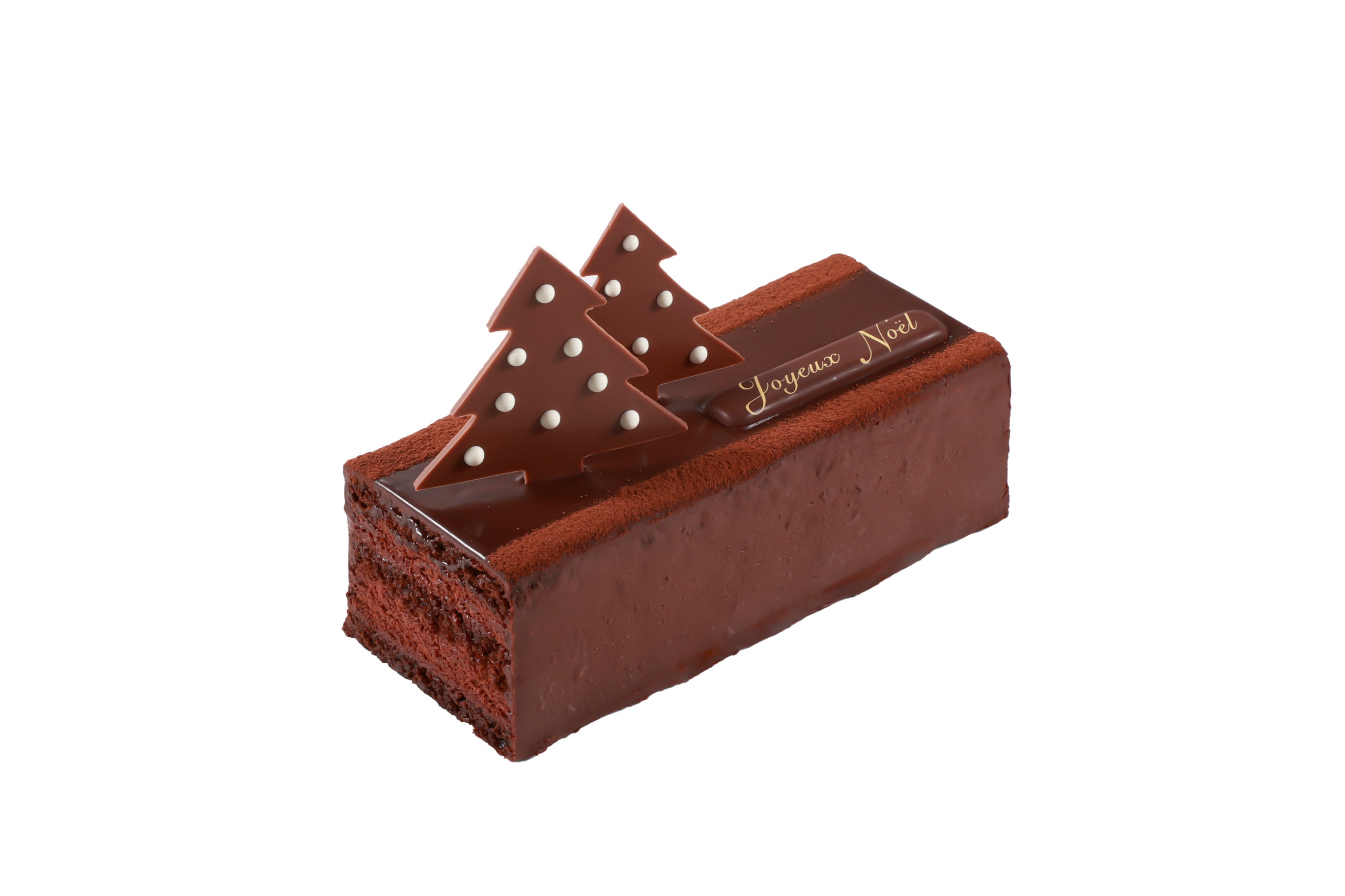 カカオとアーモンドの香り高いビスキュイと、濃厚なヴェネズエラ産カカオのムースの組合せ。ジャン=ポール・エヴァンを代表する定番ガトーに、ショコラでできたツリーのデコレーション。