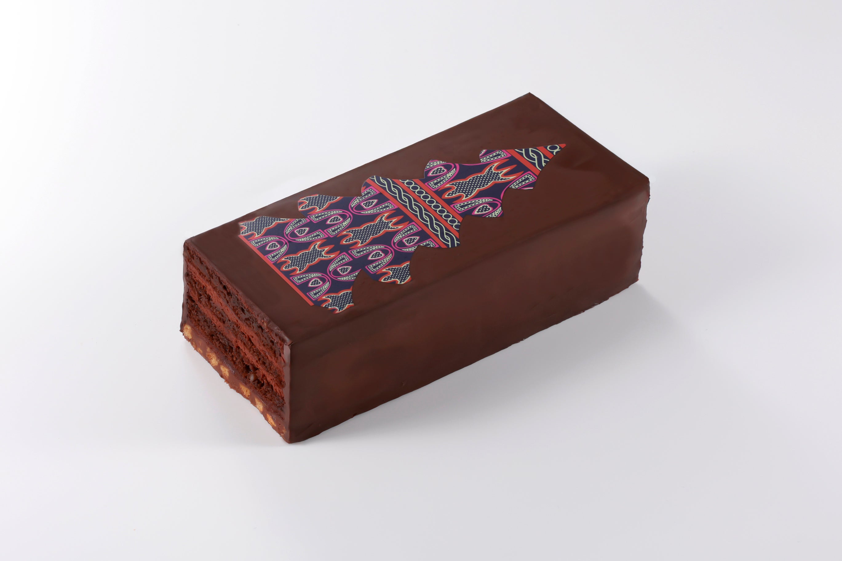 エヴァン エヌコロサンのカメルーン産カカオのムースと、キャラメルクリーム、ビスキュイショコラ、ヘーゼルナッツとキャラメル風味のミルクチョコレートのクルスティヤン。