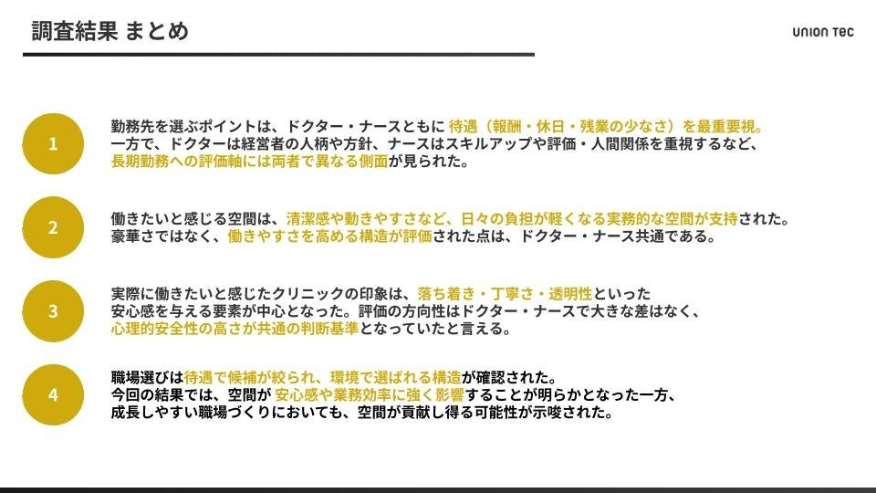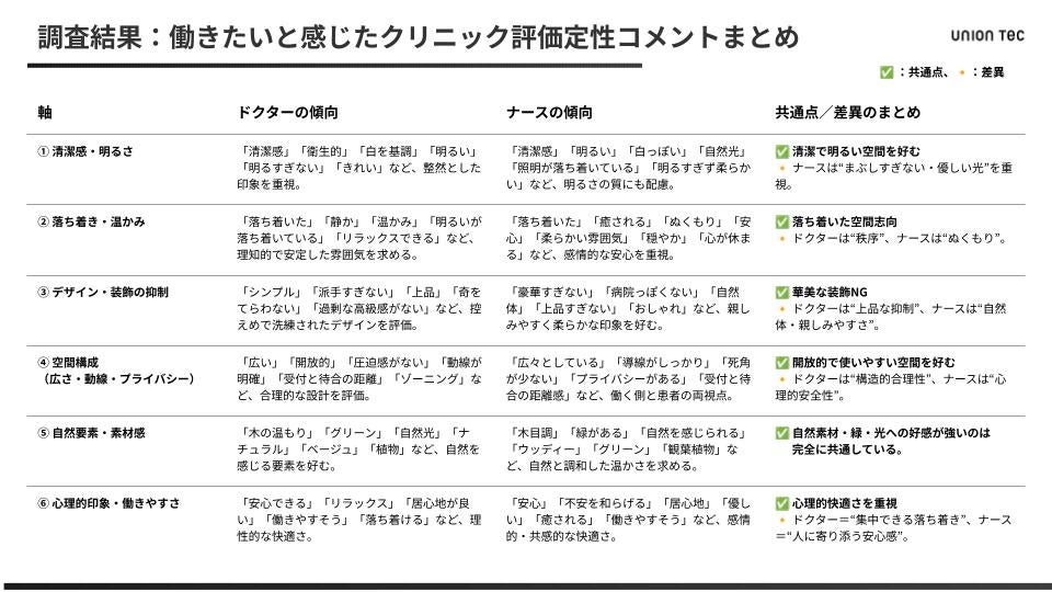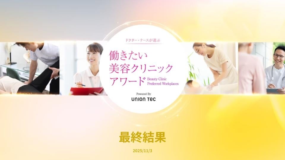 「Build a new standard.」をミッションに掲げ、オフィス・商空間・住宅の内装デザイン・設計・施工をワンストップで提供するユニオンテック株式会社(東京都渋谷区、代表取締役社長:大川祐介)は、2025年11月3日、当社主催の調査企画「ドクター・ナースが選ぶ 働きたい美容クリニックアワード」の最終結果を発表しました。あわせて、本アワードの審査過程で実施したアンケート調査をもとに、医療従事者が「働きたい」と感じるクリニック空間の傾向を分析した調査レポートを公開しています。