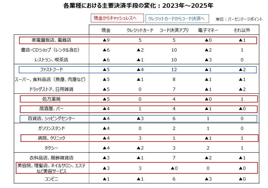 病院や美容サービス、処方薬局のように現金決済が主流の業種は、現金からキャッシュレス決済への移行が着実に進んでいることが分かります。一方で、ファストフードや百貨店など以前よりクレジットカード利用が多かった業種においては、コード決済アプリが代替されています。