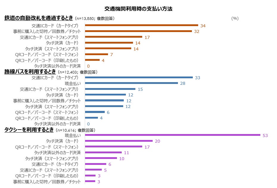 質問「鉄道・バス・タクシーなど公共交通機関の利用について伺います。鉄道の自動改札を通過するとき、何を使用していますか。路線バスやタクシーを利用するとき、どのように支払っていますか。直近6か月で、利用したことがあるものをすべてお答えください。」