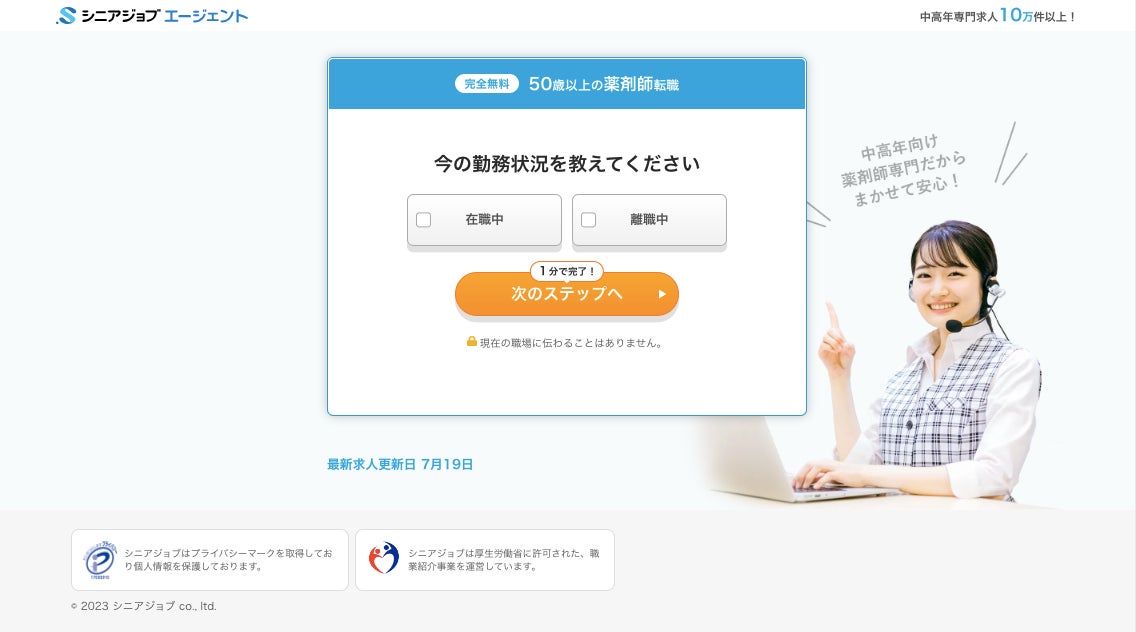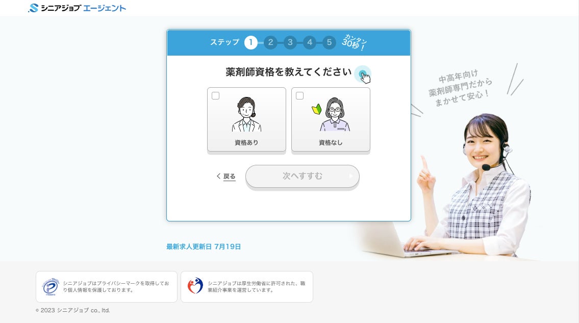 今回の薬剤師の人材紹介強化にともなって見直しが行われた専用登録ページ(https://senior-job.co.jp/pharmacist-slp3)は、これまで以上にシンプルなものとなり、約1分程度で登録できる簡単な選択や入力だけのものとなっています。