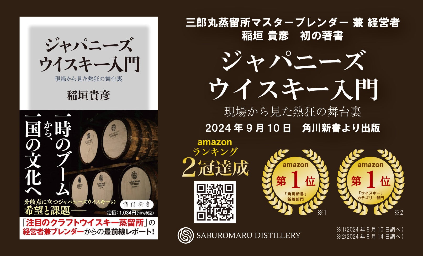 このたび、若鶴酒造株式会社(本社:富山県砺波市三郎丸)代表取締役社長 稲垣貴彦の初著書である 『ジャパニーズウイスキー入門 ~現場から見た熱狂の舞台裏~』 が、9月10日(火)に角川新書より発売されます。本書は、Amazonの「角川新書」新着部門(※1)、および「ウイスキー」カテゴリー(※2)の2部門にて、ランキング1位を獲得しております。