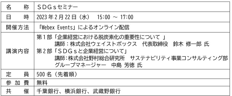 千葉銀行(頭取 米本 努)は、2023年2月22日(水)、「千葉・横浜パートナーシップ」を組むコンコルディア・フィナンシャルグループの横浜銀行(頭取 片岡 達也)および「千葉・武蔵野アライアンス」を組む武蔵野銀行(頭取 長堀 和正)と、SDGs経営の向上に取り組んでいる事業者の皆さまを対象とした「SDGsセミナー」を共催します。