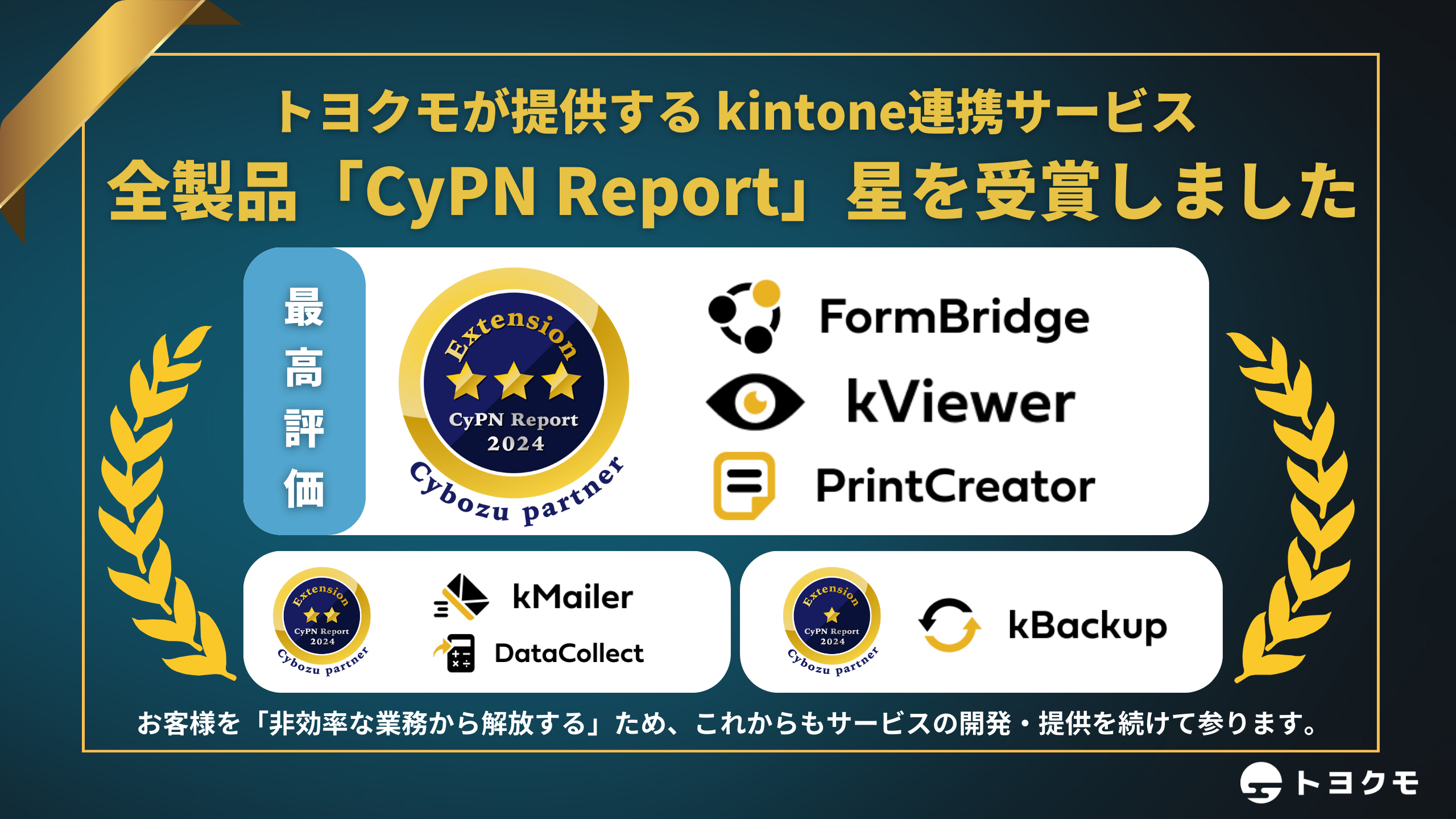 トヨクモ株式会社(本社:東京都品川区、代表取締役社長:山本 裕次、以下トヨクモ)は、サイボウズ株式会社(本社:東京都中央区、社長:青野 慶久、以下サイボウズ)が提供する業務改善プラットフォーム「kintone」と連携するkintone連携サービスが、サイボウズが設定している評価基準「Cybozu Partner Network Report(以下CyPN Report)」にて、3年連続3製品で最高評価の3つ星を獲得。また他3製品でも星を獲得し、提供している全ての製品で星を獲得したことをお知らせいたします。
