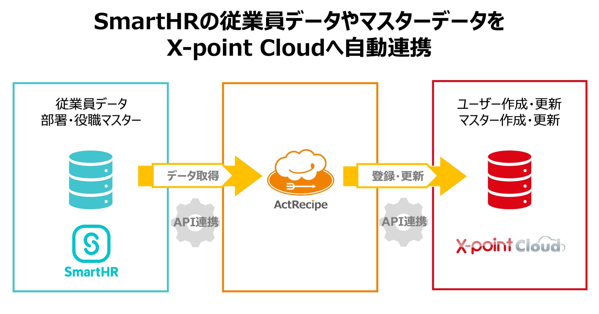 エンタープライズiPaaS「ActRecipe」を提供するアクトレシピ株式会社(本社:東京都港区、代表取締役CEO:池上大介)は、株式会社エイトレッド(本社:東京都渋谷区、代表取締役社長:岡本康広)が提供するクラウド型ワークフロー「X-point Cloud」と「ActRecipe」とのAPI連携に対応したことを発表いたします。また、「X-point Cloud」とクラウド人事労務ソフト「SmartHR」とを連携する機能の提供を開始いたします。