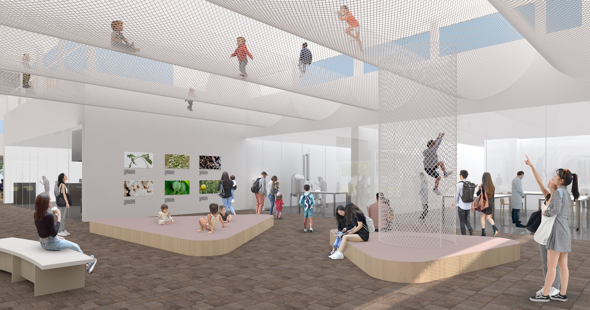 天井部分にジャングルネットを張るキッズスペースは、大人も子どもも共に過ごせるよう設計しました。自由に動き回ることができるネットの上は、子どもたちだけの空間でありながら、地上から大人がその様子を見守ることができるようにすることで、ご家族で一緒に訪れても、子どもたちだけで遊びに来ても、それぞれの時間を安心して過ごせる空間を目指しています。