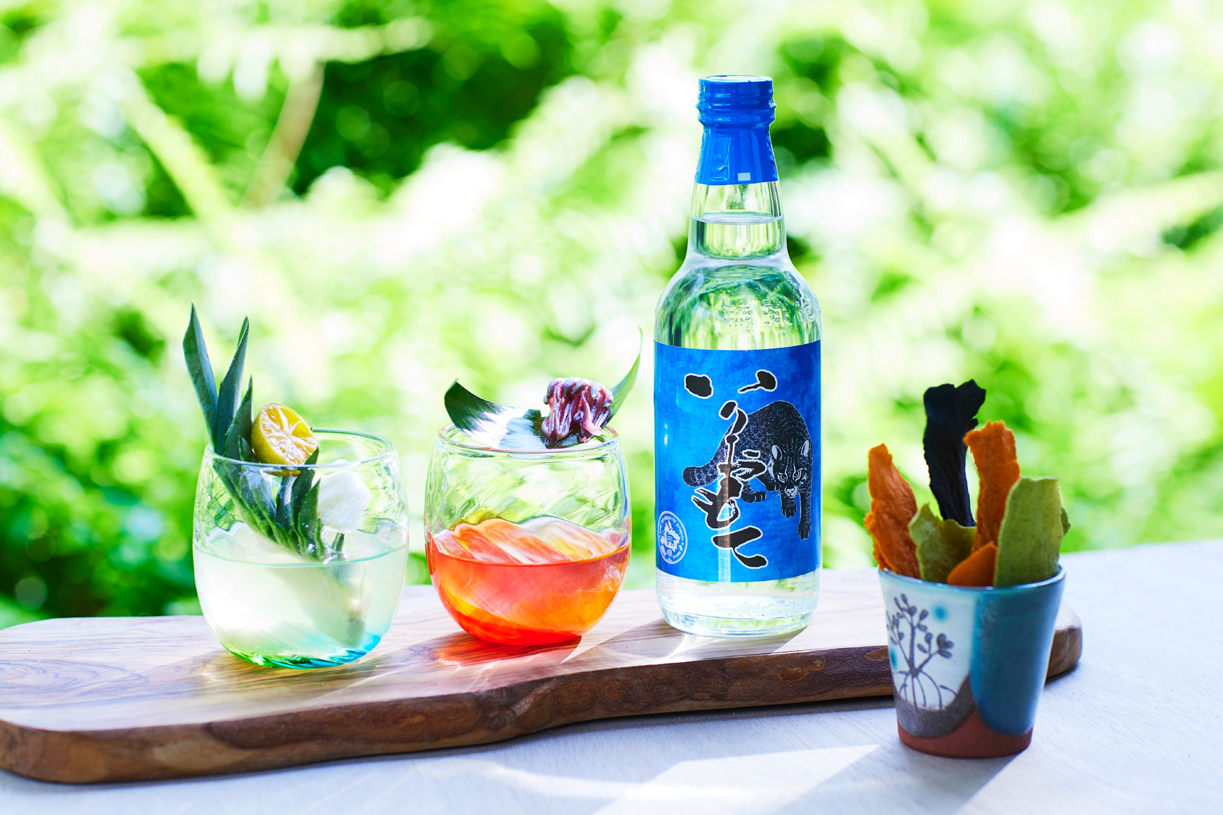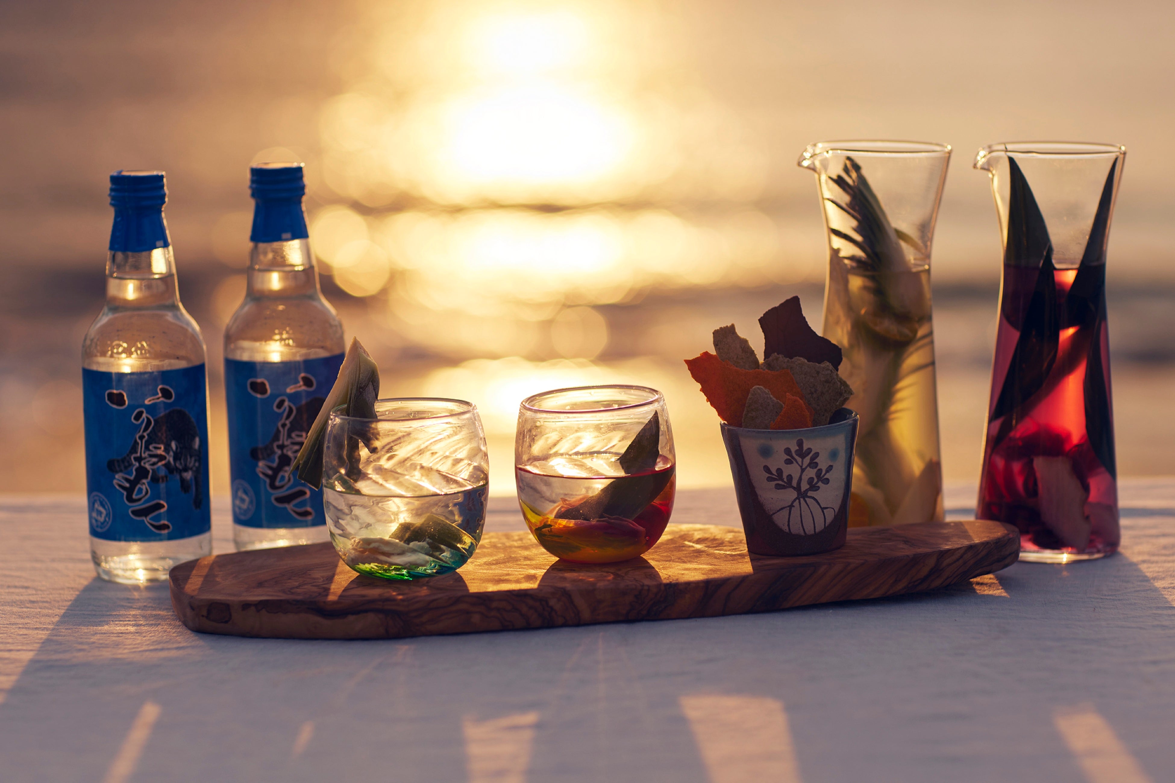 当イベントでは、西表島の水を使ってできた泡盛「いりおもて」を、毎日夕日の時間に合わせて、ふるまいます。月桃やパイナップルなど島で親しまれている素材を使用。「いりおもて」本来の風味を損なわずに、泡盛をはじめて飲む人でも、まろやかな味わいを楽しむことができます。また、おつまみには、イカスミやトマト、バジル風味のチップスを用意。夕日を眺めながら、泡盛と一緒に手軽に食べられます。