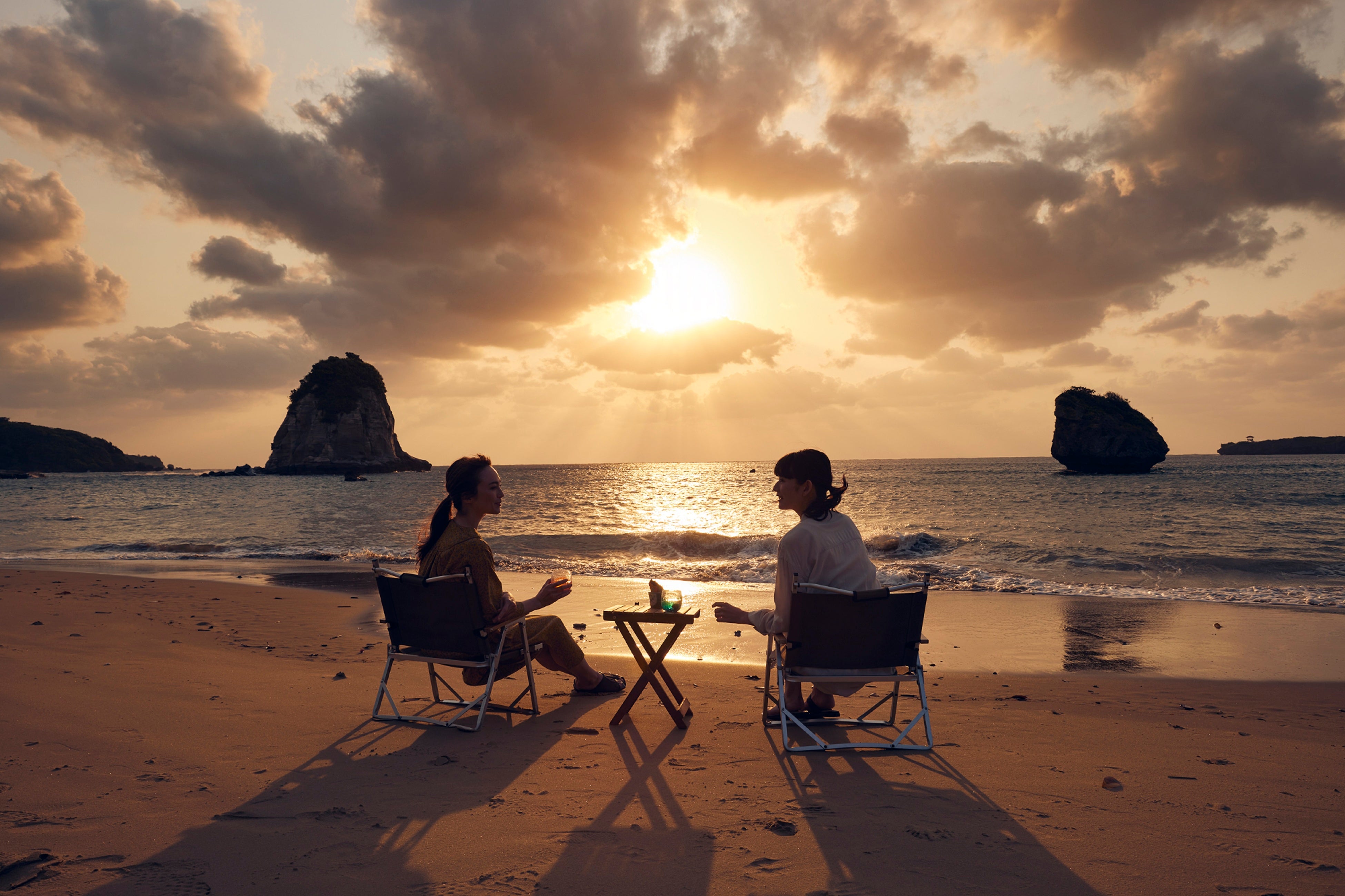 ~ビーチで波の音に耳を傾け、水平線上に沈む夕日を眺めるひととき~