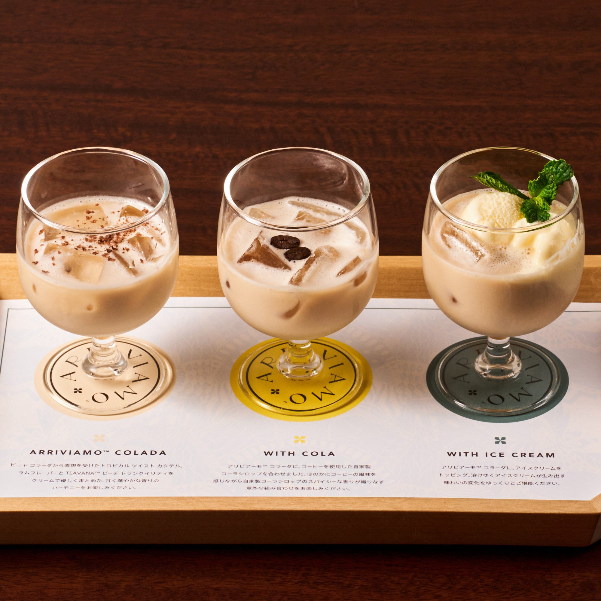 1階のメインバーからは、エスプレッソと日本で愛されてきたわらび餅や黒糖を合わせ、さらに米糀からできたミルクを使用した『米糀ミルク使用 黒糖 わらび餅 パフェ ラテ』、開発者がイタリアで出会ったミルクのジェラートにオリーブオイルとソルトを添えて楽しむスタイルから着想を得て、オリーブオイルのジェラートとコールドブリューコーヒーを合わせた新しい「オリアート™」、2階のティバーナ™ バーからは南国のリゾートで味わう贅沢な時間をイメージしたティービバレッジ『ティバーナ™ フローズン パイナップル コナ ポップ』、3階のアリビアーモ™ バーからは3種の異なるピニャコラーダのツイストカクテルを飲み比べできる『アリビアーモ™ コラーダ フライト』が登場します。