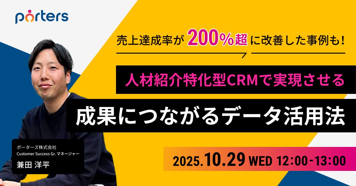 人材ビジネス向けマッチングシステムを提供するポーターズ株式会社(東京証券取引所グロース. 証券コード5126、東京都港区、代表 西森 康二)は、「人材紹介特化型CRMで実現させる、成果につながるデータ活用方法」と題した無料セミナーを2025年10月29日(水)12:00~オンラインで開催いたします。