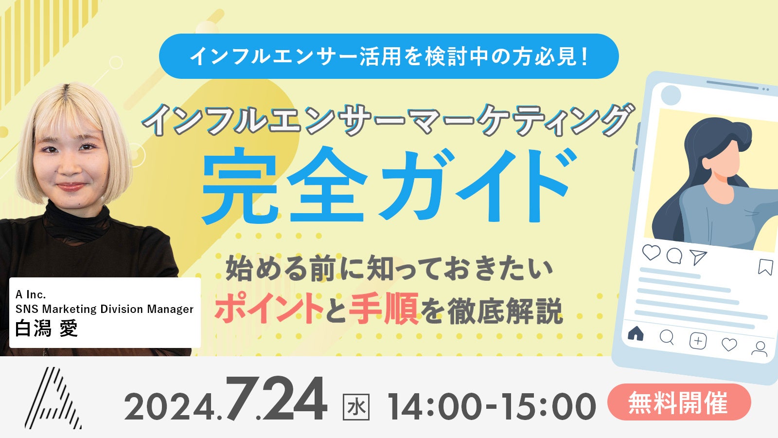 株式会社A(https://acetokyo.com/)は、「【インフルエンサー活用を検討中の方必見!】インフルエンサーマーケティング完全ガイド 〜始める前に知っておきたいポイントと手順を徹底解説〜」と題した無料ウェビナーを7月24日(水)にオンラインで開催します。