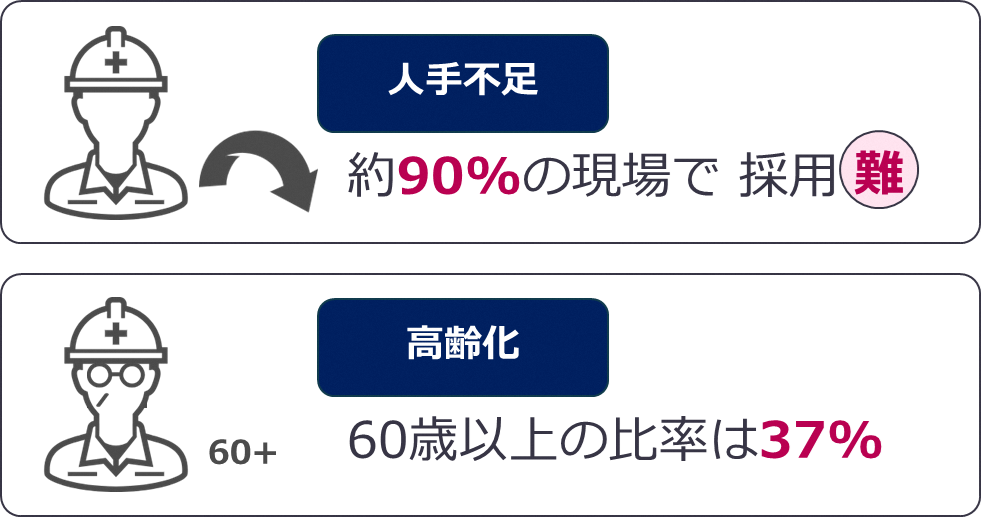 現場担当者の悩みごとのトップとして現場作業員の不足がありますが、現場作業員の採用に対しては89.7%の担当者が「集まりにくい」と回答していることから、慢性的な人手不足を解消することが非常に難しいことが分かります。ほかにも、60歳以上の作業員比率は約37.2%以上となっており定年退職の対応が必要となりますが、約77.2%の担当者からは「現場従業員の若返りが図りにくい」という悲観的な回答が出ており、抜本的な改善までは時間を要することがうかがえます。(※1)