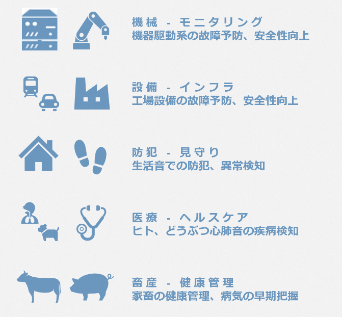 音による異音検知は、工場インフラの異常検知、機械音検知をはじめとして、足音や防犯、ヒトの発する音や動物の鳴き声など、幅広い業種・業態で利用することが可能です。