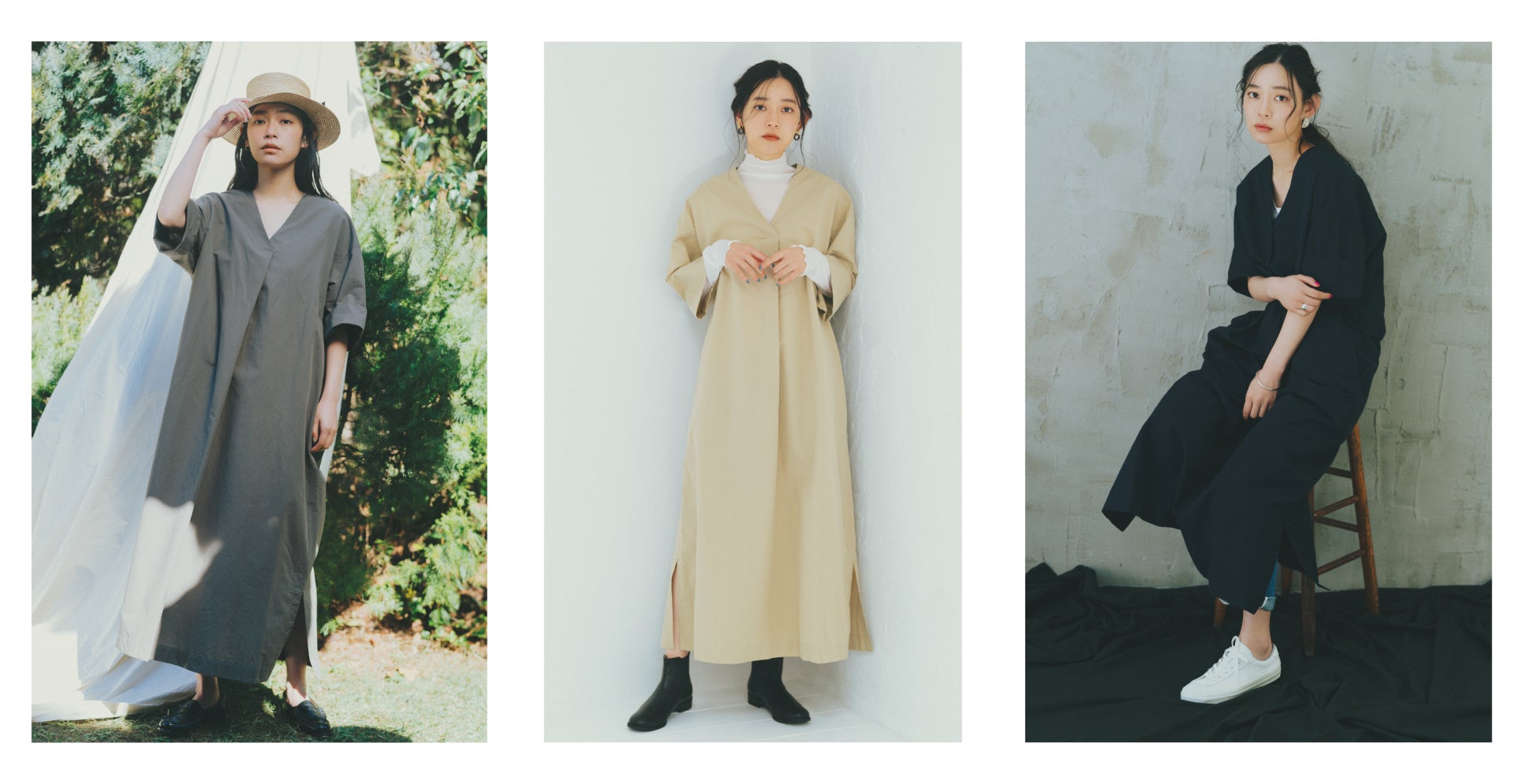 「どんなシチュエーションでも着られる、飽きのこない大人ワンピースを作りました。一見シンプルだけど実際に着てみると、ハッとしていただけるポイントがたくさん。襟ぐりは首元をすっきり綺麗に見えるような絶妙な空き具合に。のっぺりしないようにデザイン性のあるタックを前見頃にいれていただきました。ずっと長く着られるような洗練されたシルエットに加えて、裾のスリットを深く入れることで全体の抜け感や、ボトムスを重ねてチラッと見える楽しみをプラスしました。」